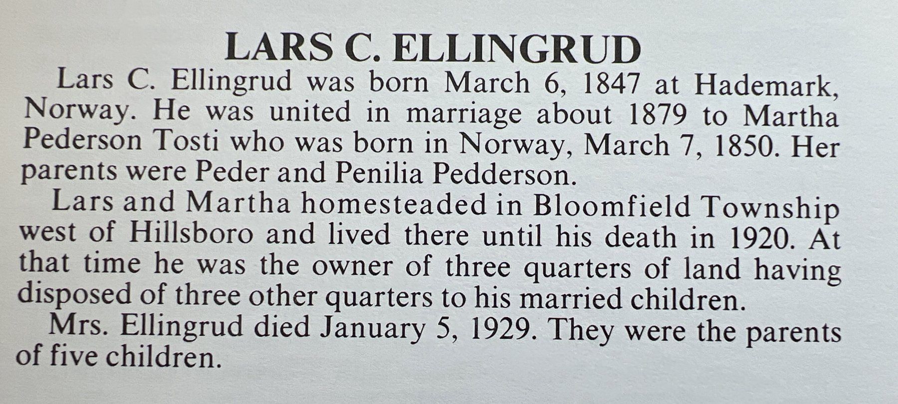 This family history folder also contains a brief description about Lars and Martha Ellingrud published in Vol. I of "Yesteryears" the history of Traill County book (below).