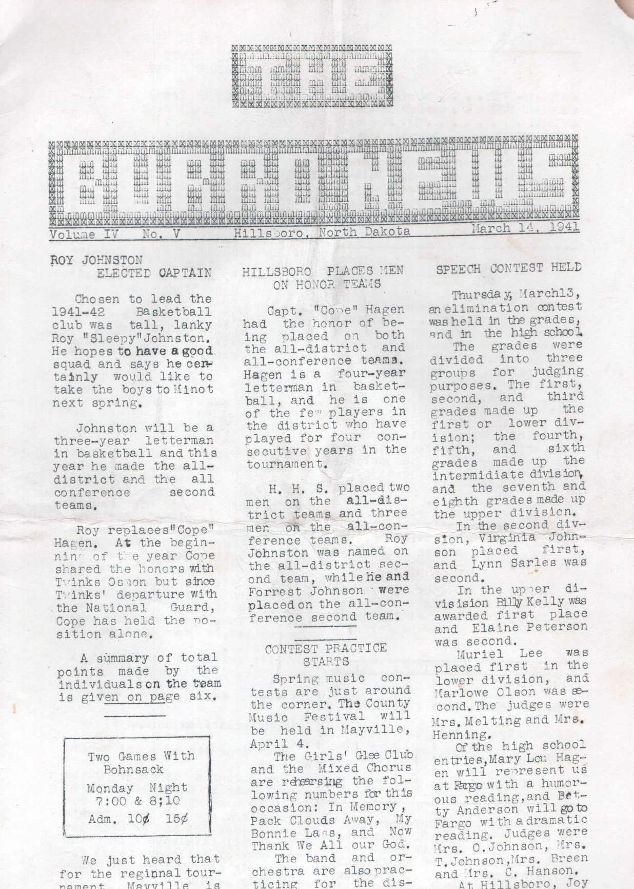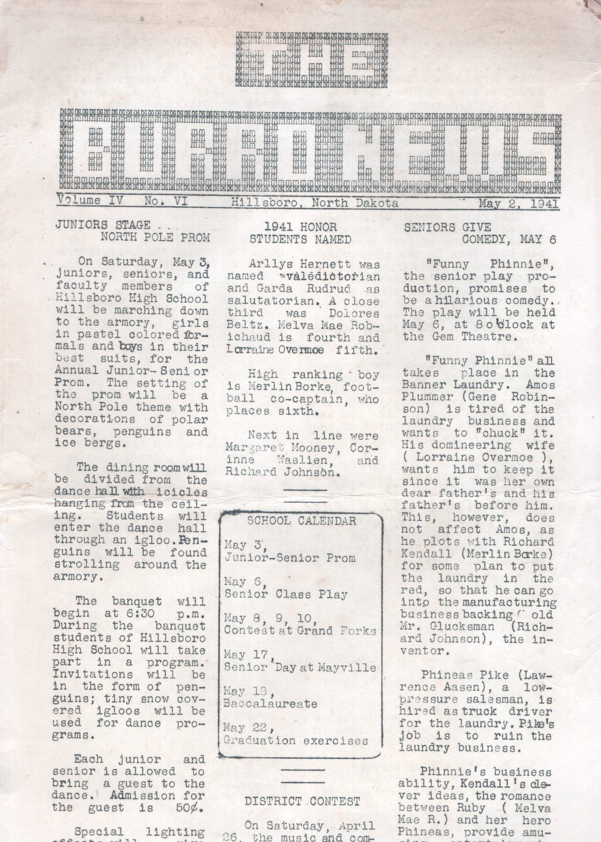 In 1941, from March to May, the Hillsboro High School students published a newspaper titled "The Burros' News". The newspaper staff included Delores Meyer, Editor; Corinne Waslien, Assoc. Editor; Lawrence Aasen, Sports; and Reporters Dona Mae Anderson, Dolores Beltz, LaVerne Doeden, Lorraine Engel, Mary Lou Hagen, Wilma Henka, Ardis Johnson, Roger King, Irene Koering, Margaret Mooney, Dorothy Odden, Lorraine Overmoe, and Lois Sundby .