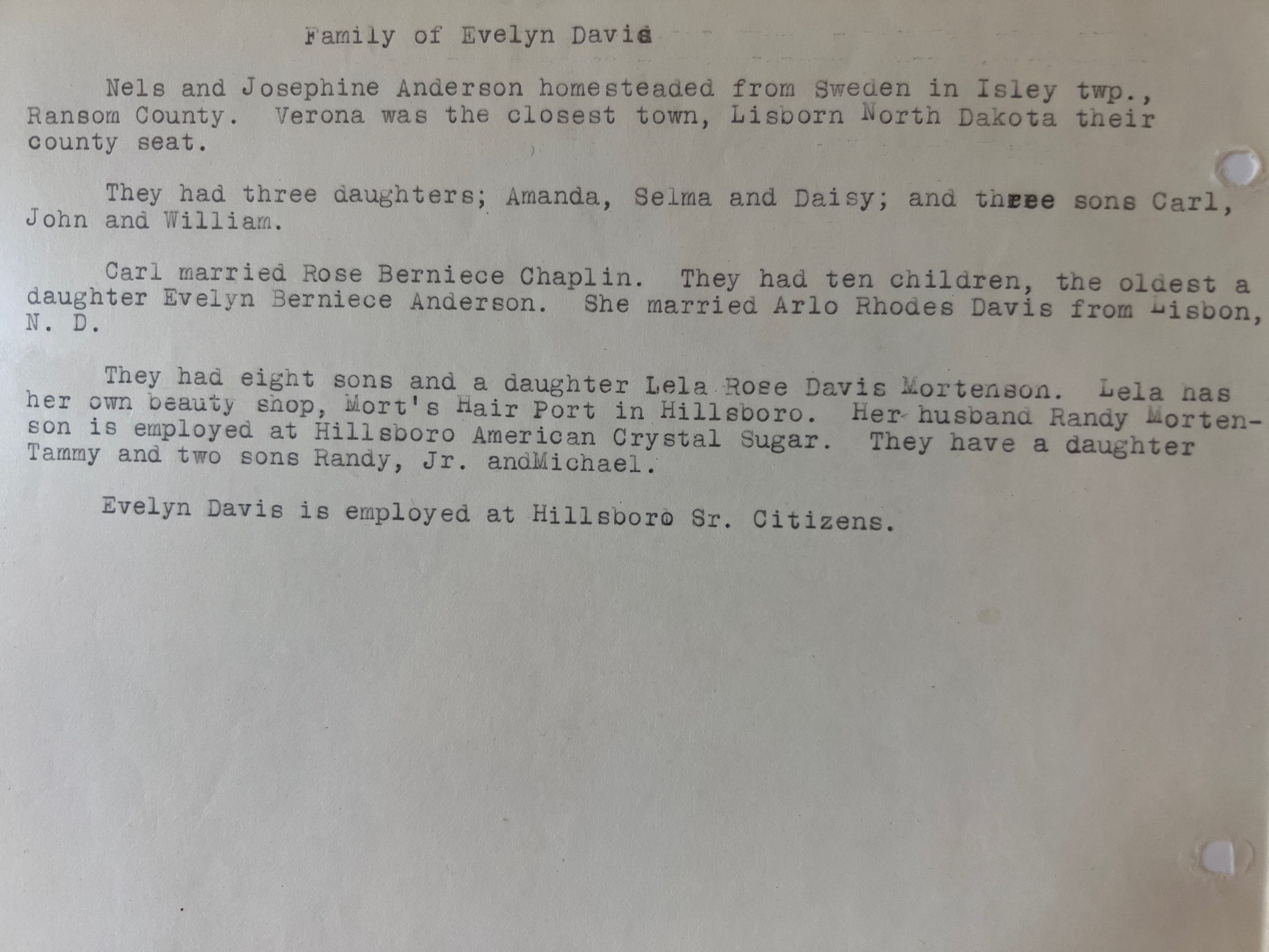 This file has a document contributed by Evelyn (Anderson) Davis describing her ancestors: parents Carl and Rose Anderson and grandparents Mels and Josephine Anderson.