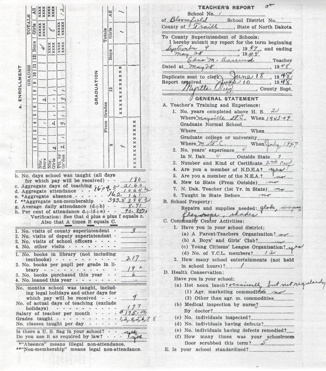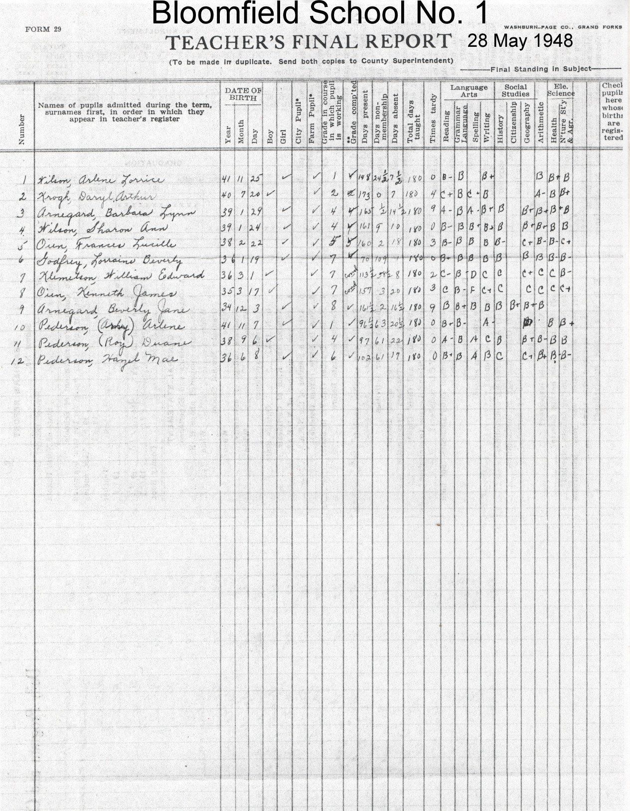 On 28 May 1948, Bloomfield School No. 1 teacher Edna M. Aaserud reported attendances and standings in studies pursued for 12 students, including Barbara Arnegard, Beverly Arnegard, Lorraine Godfrey, William Klemetson, Daryl Krogh, Frances Oien, Kenneth Oien, Arlene Pederson, Duane Pederson, Hazel Pederson, Arlene Wilson, and Sharon Wilson.