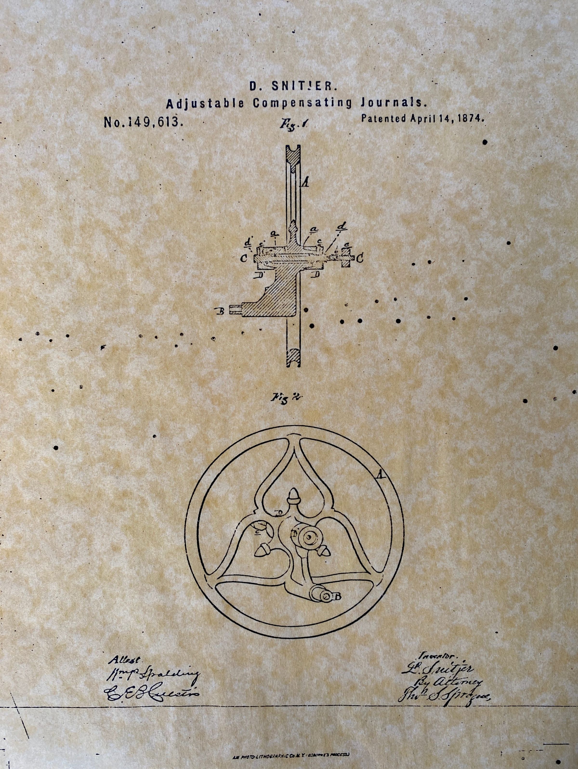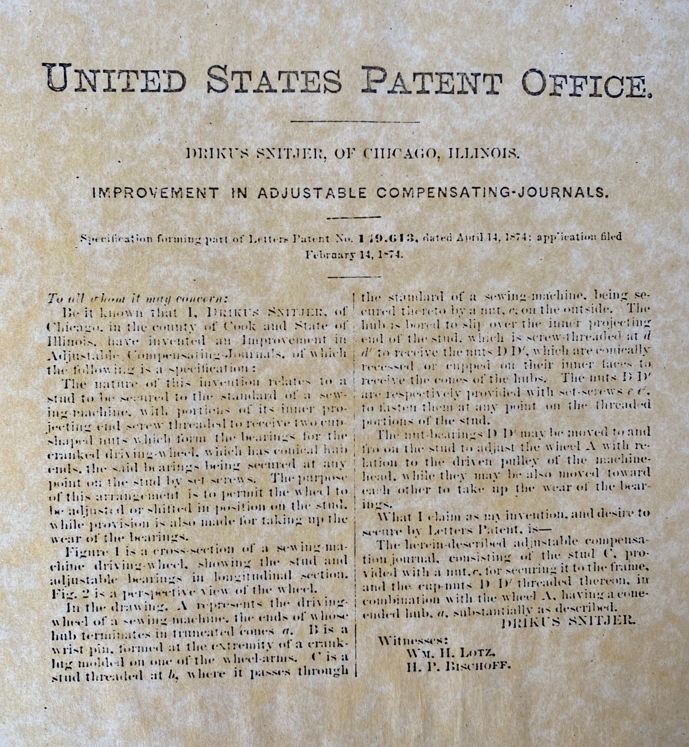 Patent No. 149,613 - Adjustable Compensating Journals (Sewing Machine Wheel) - 1874. Drikus SnitjerCataloged By