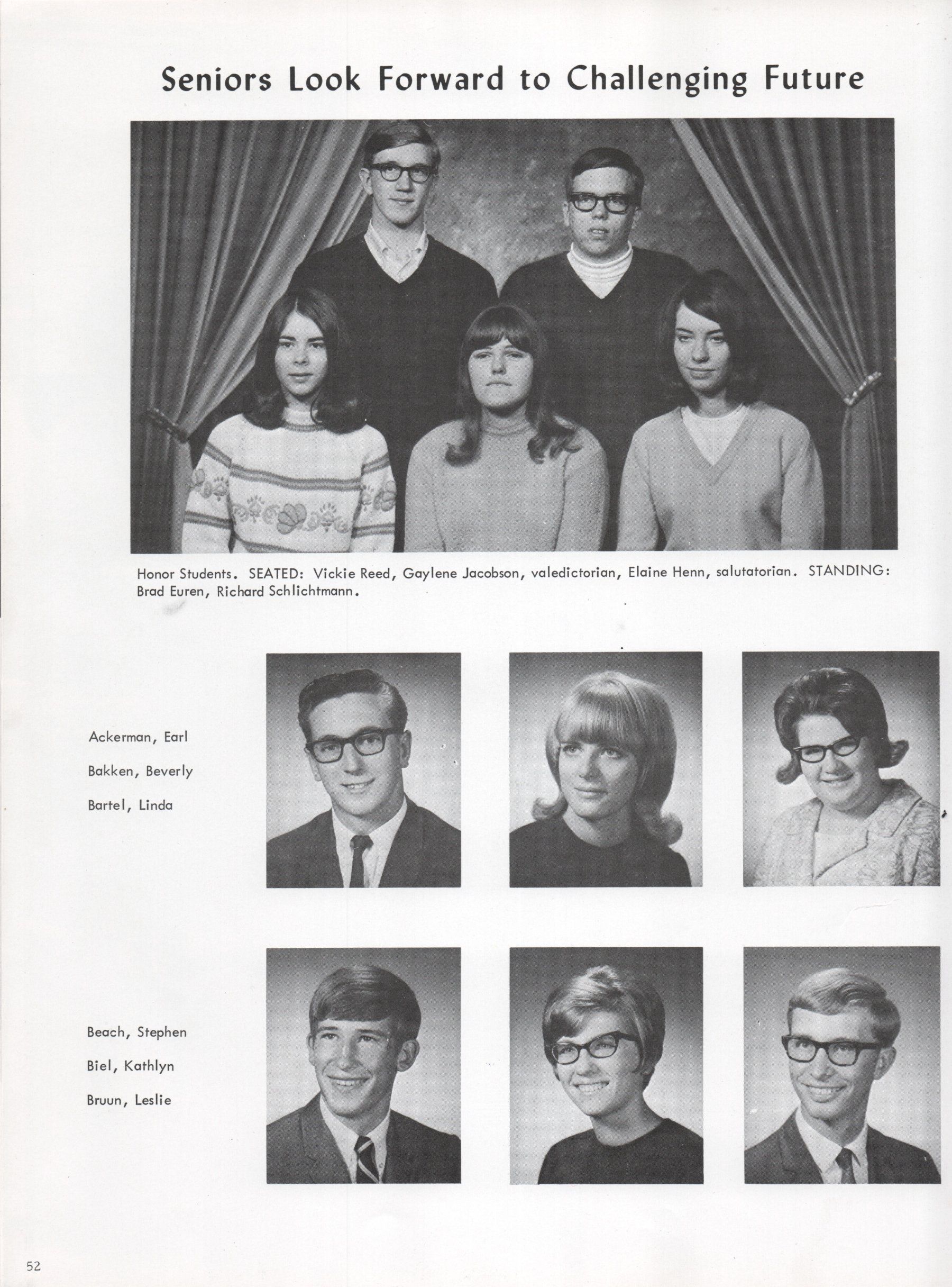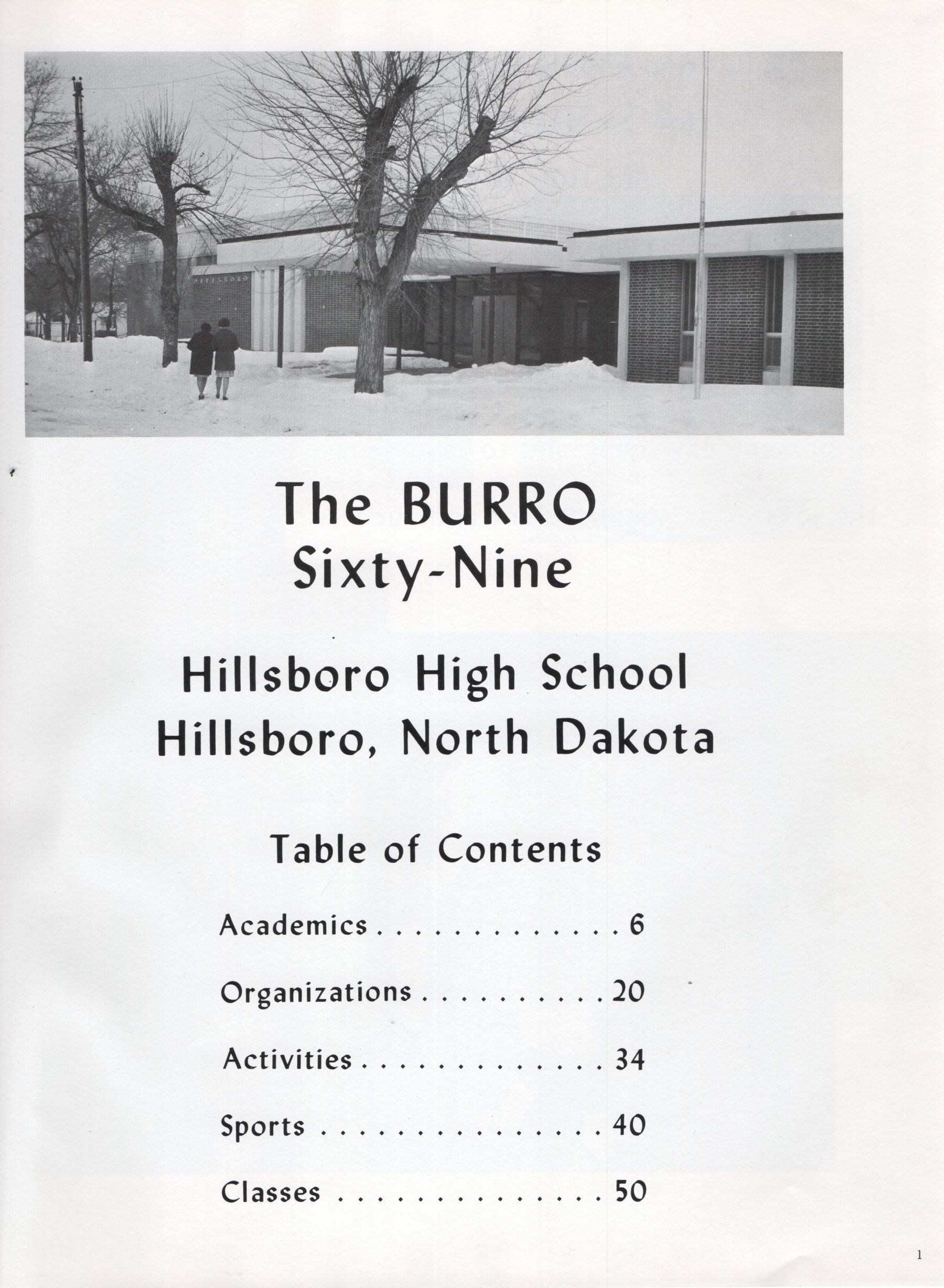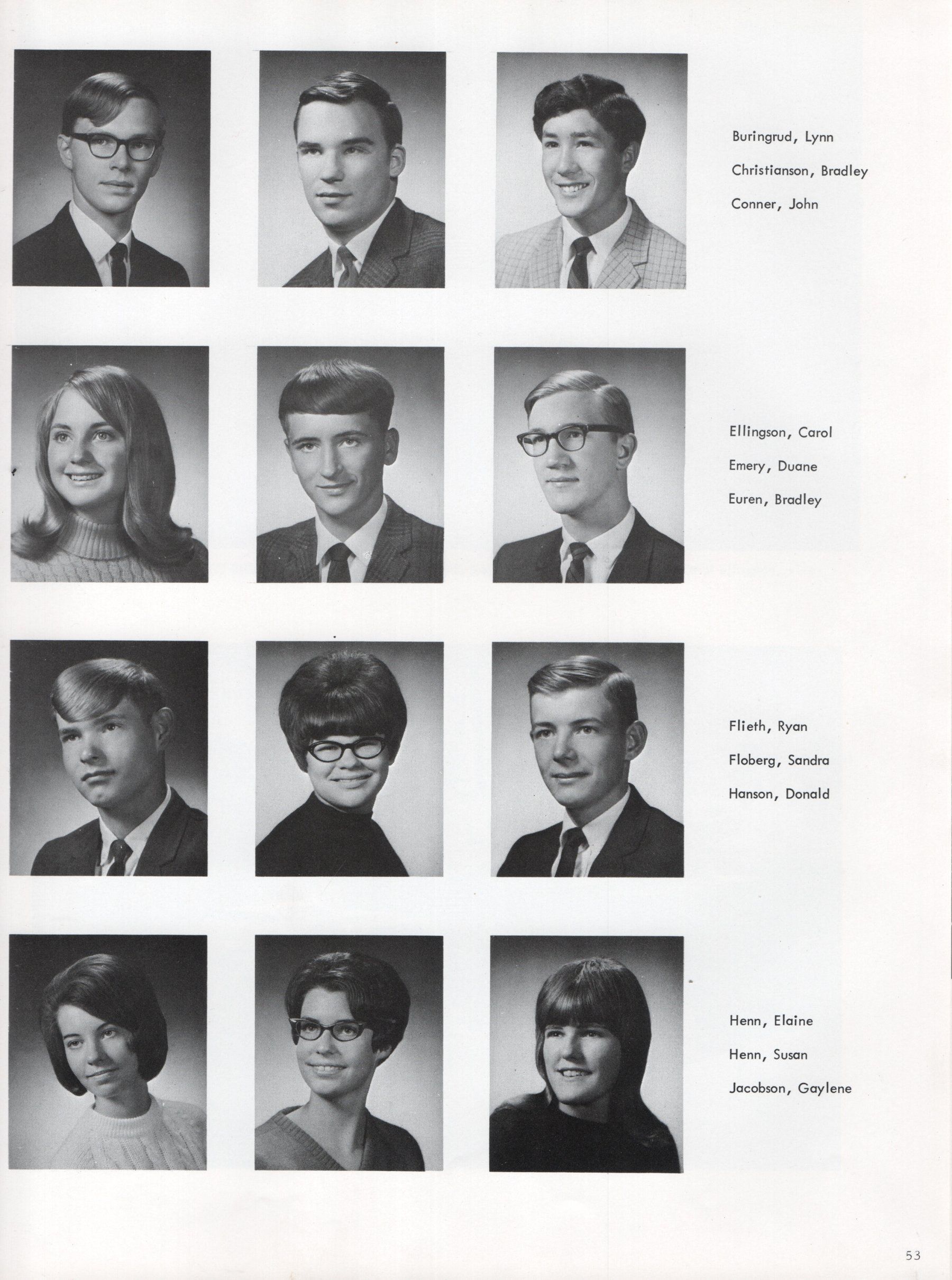 The Class of 1969 Hillsboro High School Yearbook, titled: The Burro 1969, includes six pages of Class of 1969 Senior student photographs for: Earl Ackerman, Beverly Bakken, Linda Bartel, Stephen Beach, Kathryn Biel, Leslie Bruun, Lynn Buringrud, Bradley Christianson, John Conner, Carol Ellingson, Duane Emery, Bradley Euren, Ryan Flieth, Sandra Floberg, Donald Hanson, Elaine Henn, Susan Henn, Gaylene Jacobson, Diane Johnson, Sandra Johnson, Deanna Keena, Paul Kjensrud, Nettie Klemetson, Brenda Lange, Yvette Larson, Michael Magnuson, Joan Marsden, Ann McInnes, Don McInnes, Mike McNamee, Bill Mueller, Becky Nelson, Margaret Nelson, Jerry Olsen, Susan Petersen, Frances Preston, Vickie Reed, Peggy Rutherford, Patricia Sadler, Thomas Sandsmark, Richard Schlichtmann, Martha Schmar, Ralph Smith, Elizabeth Sorum, Susan Sveen, Janet Thompson, Larry Tweten, Robert Vettel, Donald Waters, and Mary Wright.