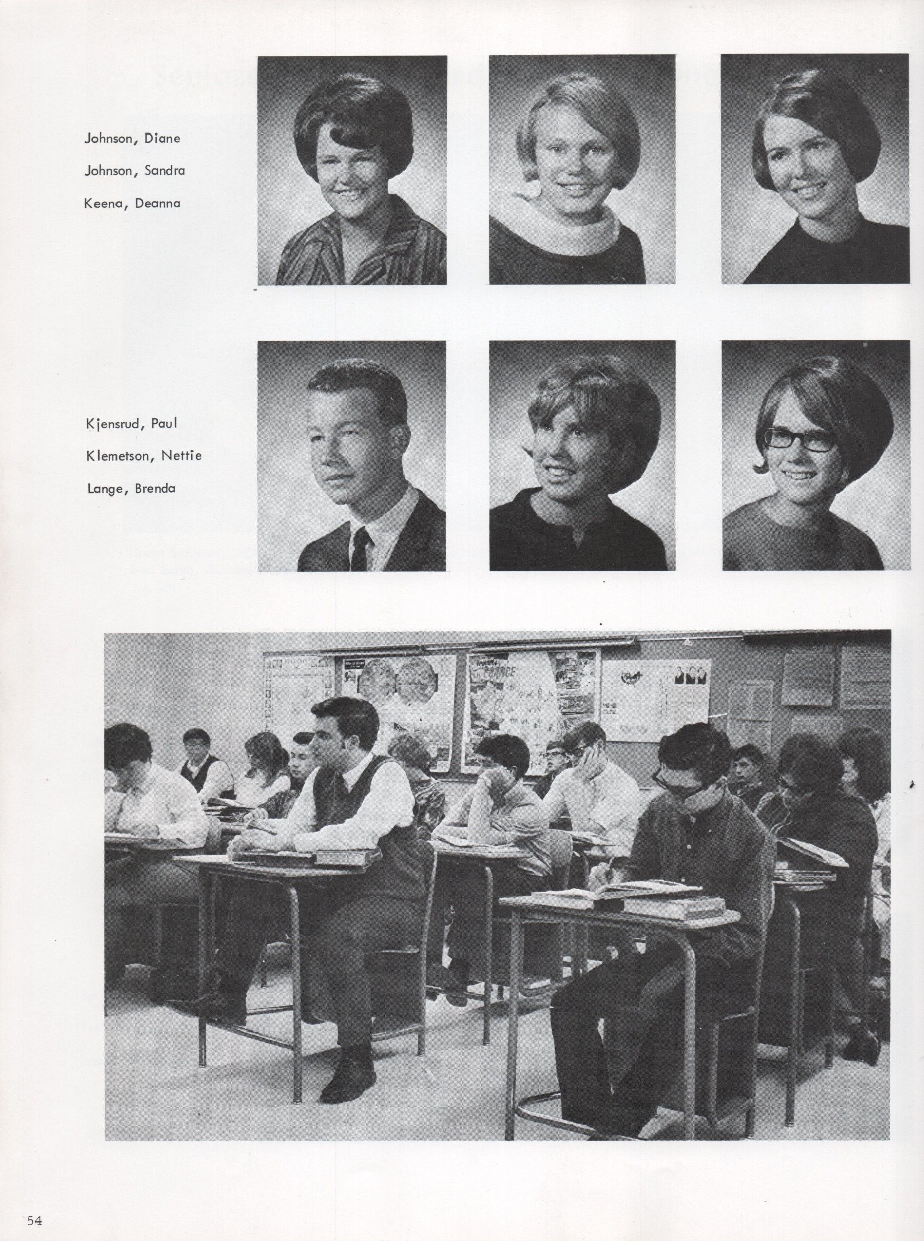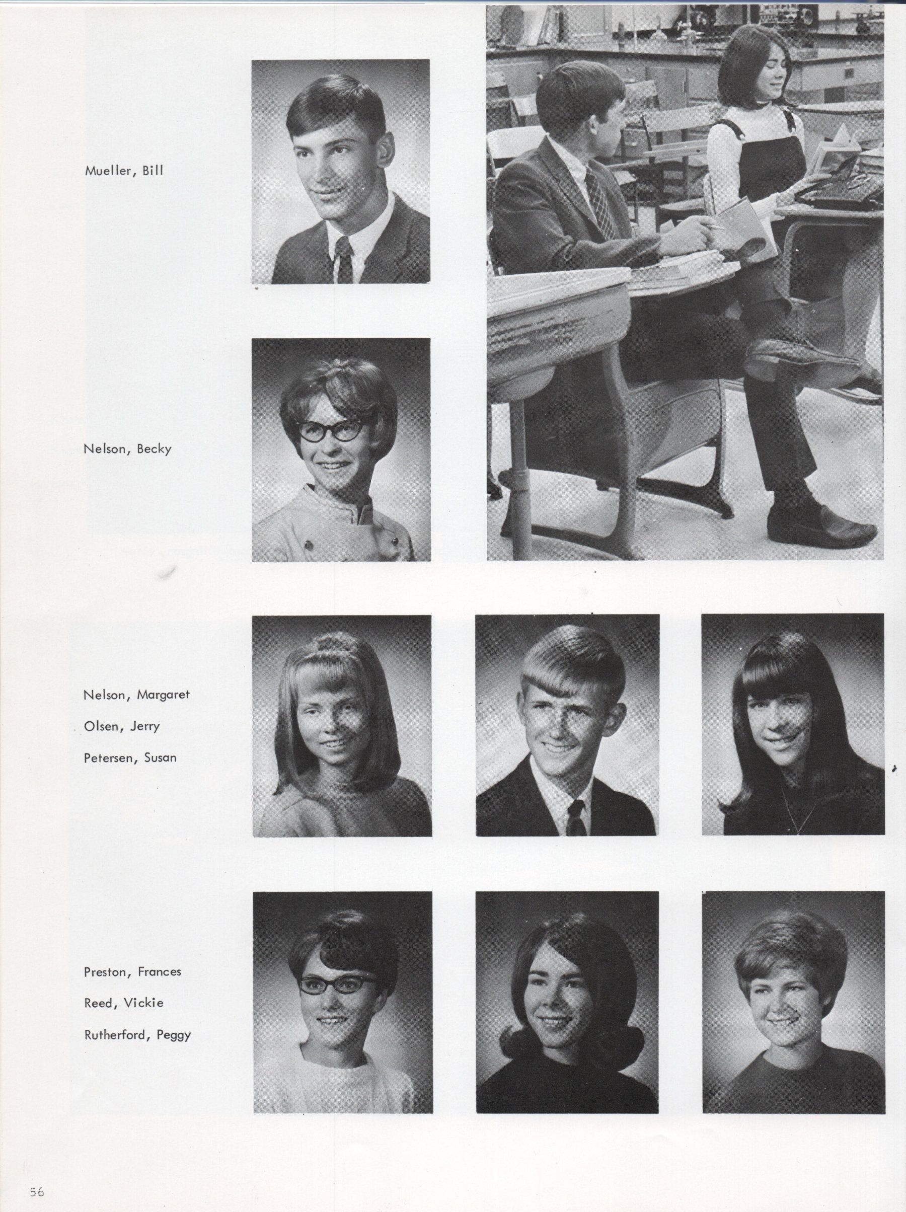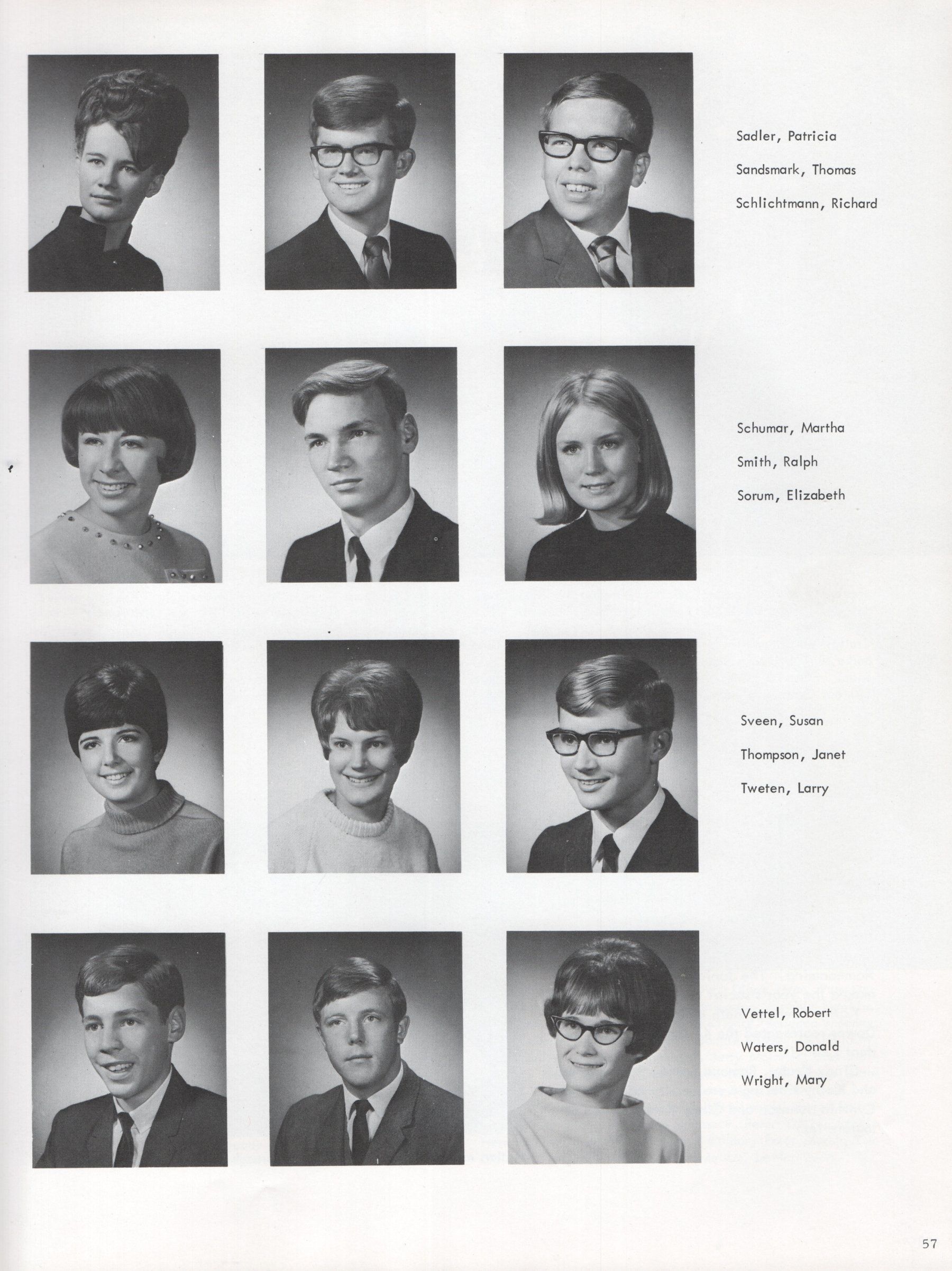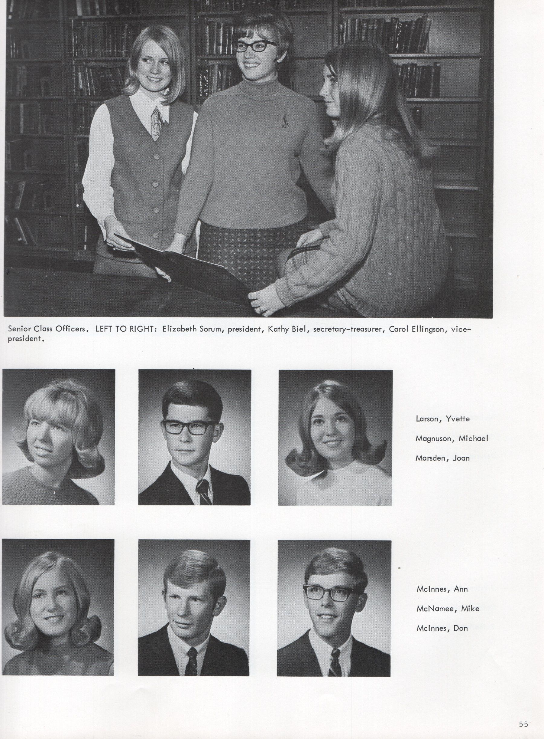 The Class of 1969 Hillsboro High School Yearbook, titled: The Burro 1969, includes six pages of Class of 1969 Senior student photographs for: Earl Ackerman, Beverly Bakken, Linda Bartel, Stephen Beach, Kathryn Biel, Leslie Bruun, Lynn Buringrud, Bradley Christianson, John Conner, Carol Ellingson, Duane Emery, Bradley Euren, Ryan Flieth, Sandra Floberg, Donald Hanson, Elaine Henn, Susan Henn, Gaylene Jacobson, Diane Johnson, Sandra Johnson, Deanna Keena, Paul Kjensrud, Nettie Klemetson, Brenda Lange, Yvette Larson, Michael Magnuson, Joan Marsden, Ann McInnes, Don McInnes, Mike McNamee, Bill Mueller, Becky Nelson, Margaret Nelson, Jerry Olsen, Susan Petersen, Frances Preston, Vickie Reed, Peggy Rutherford, Patricia Sadler, Thomas Sandsmark, Richard Schlichtmann, Martha Schmar, Ralph Smith, Elizabeth Sorum, Susan Sveen, Janet Thompson, Larry Tweten, Robert Vettel, Donald Waters, and Mary Wright.