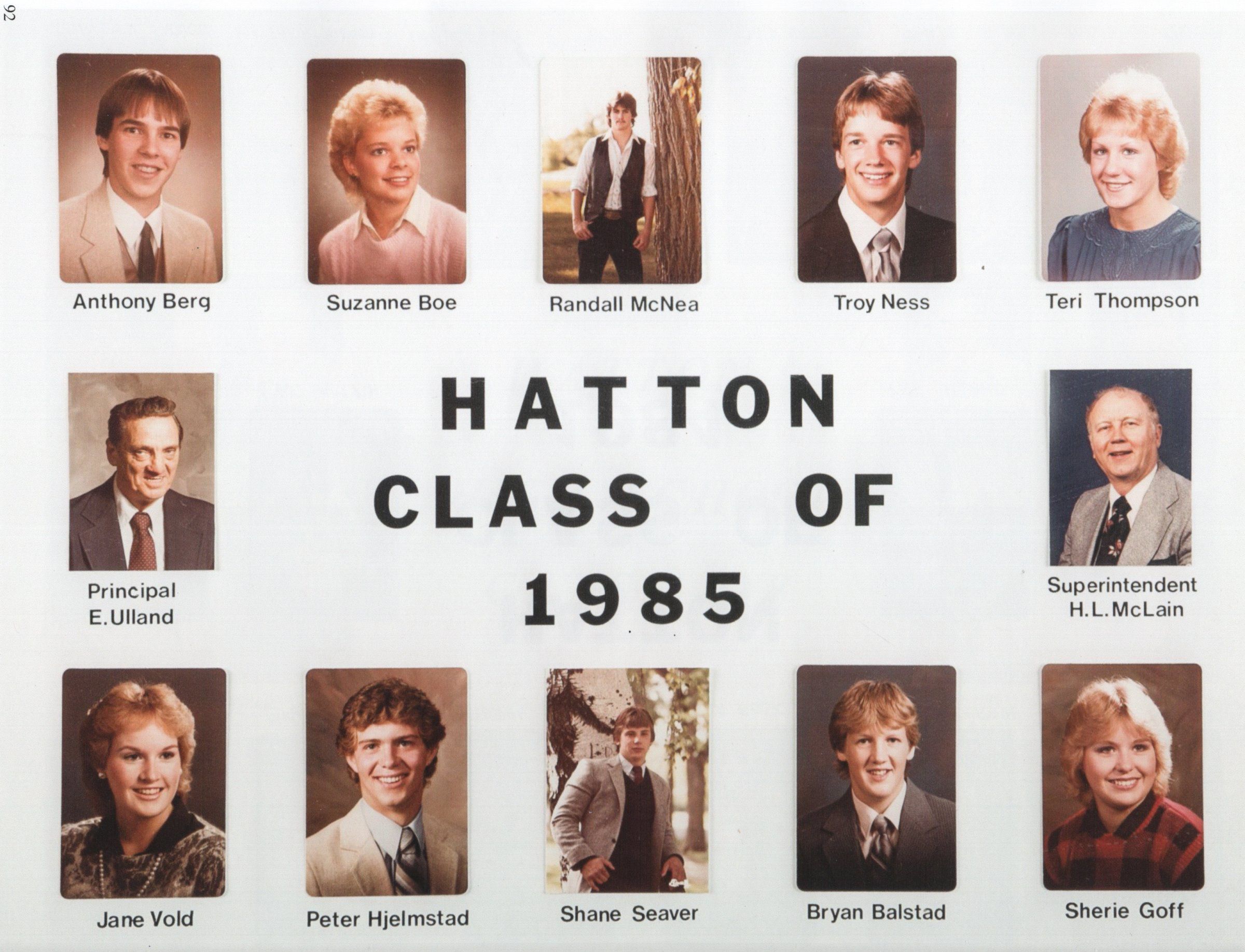 A photograph of the Hatton High School Class of 1985 is included on page 92 in the All School Reunion book, "Hatton Flyers".