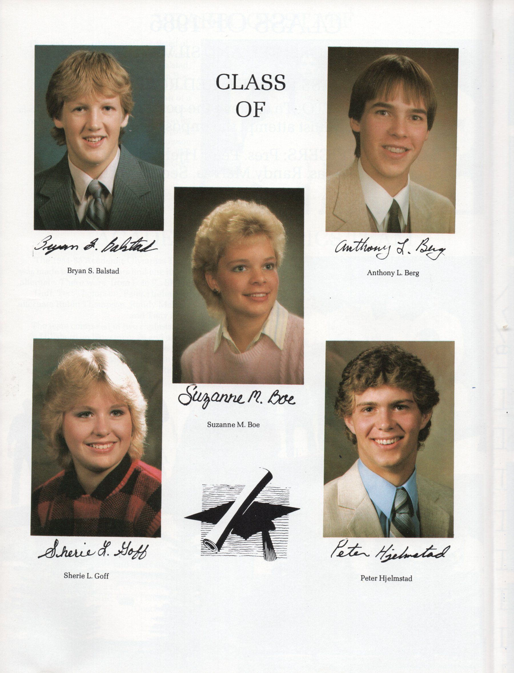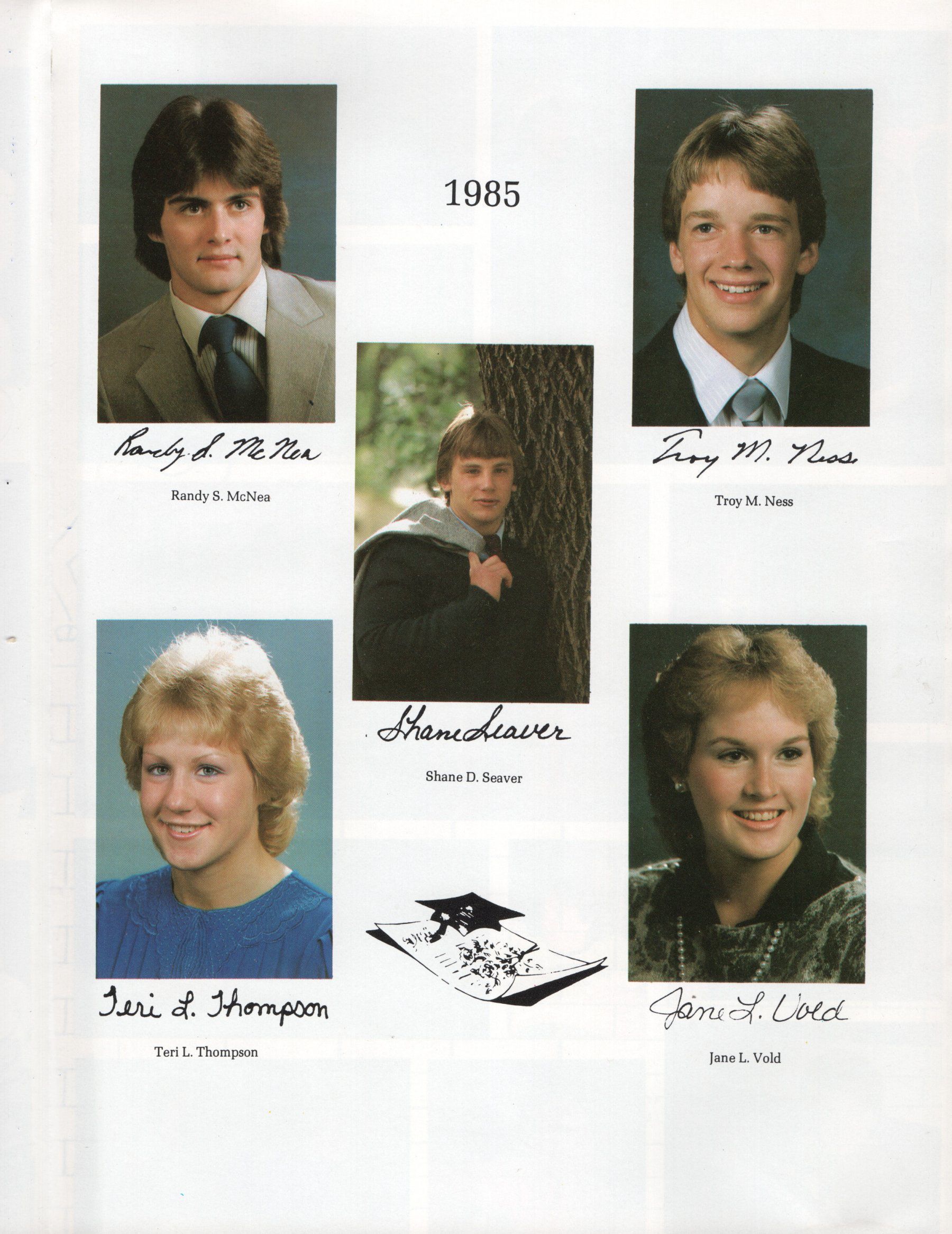 The 1985 yearbook includes two pages of Senior student photographs for: Bryan Balstad, Anthony Berg, Suzanne Boe, Sherie Goff, Peter Hjelmstad, Randy McNea, Troy Ness, Shane Seaver, Teri Thompson, and Jane Vold.