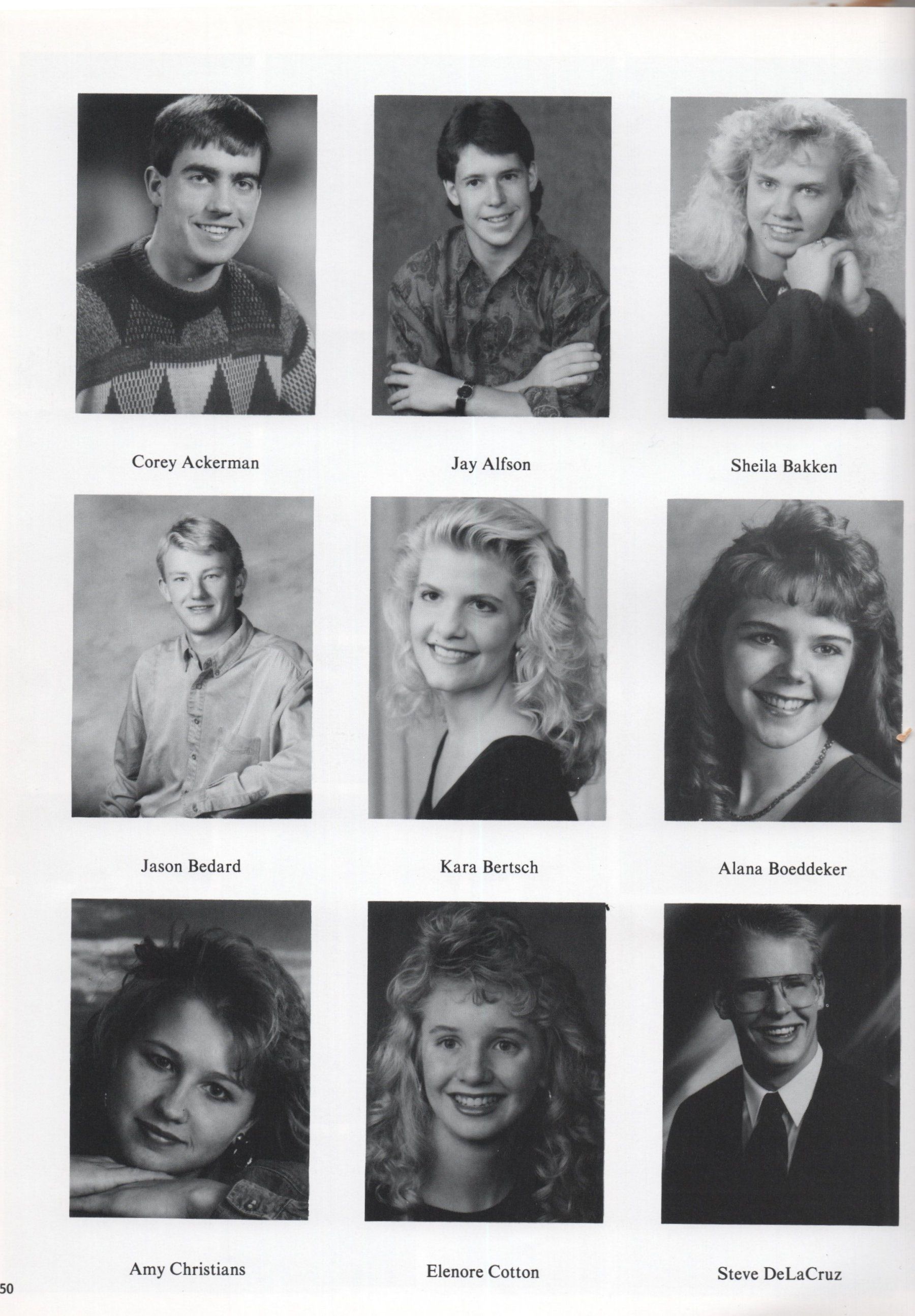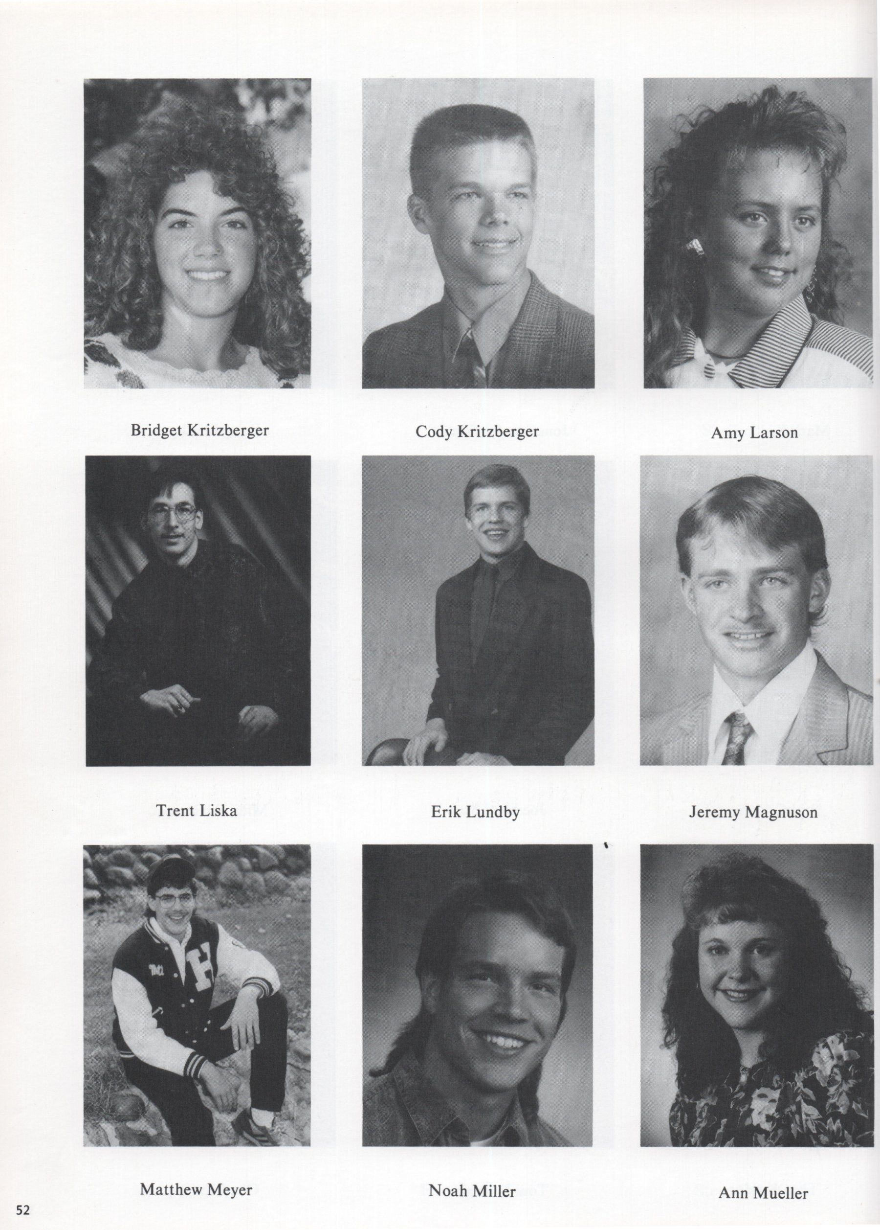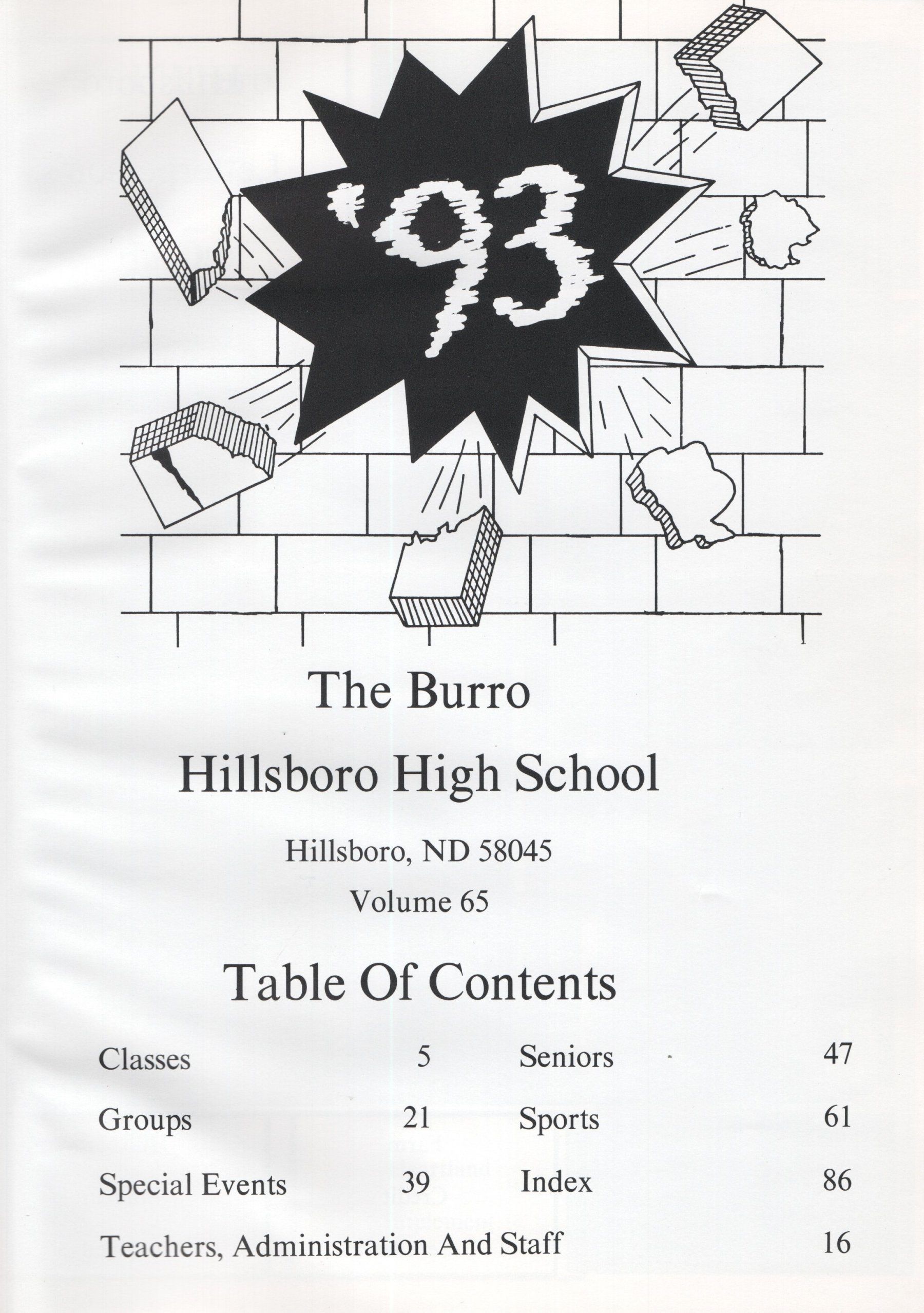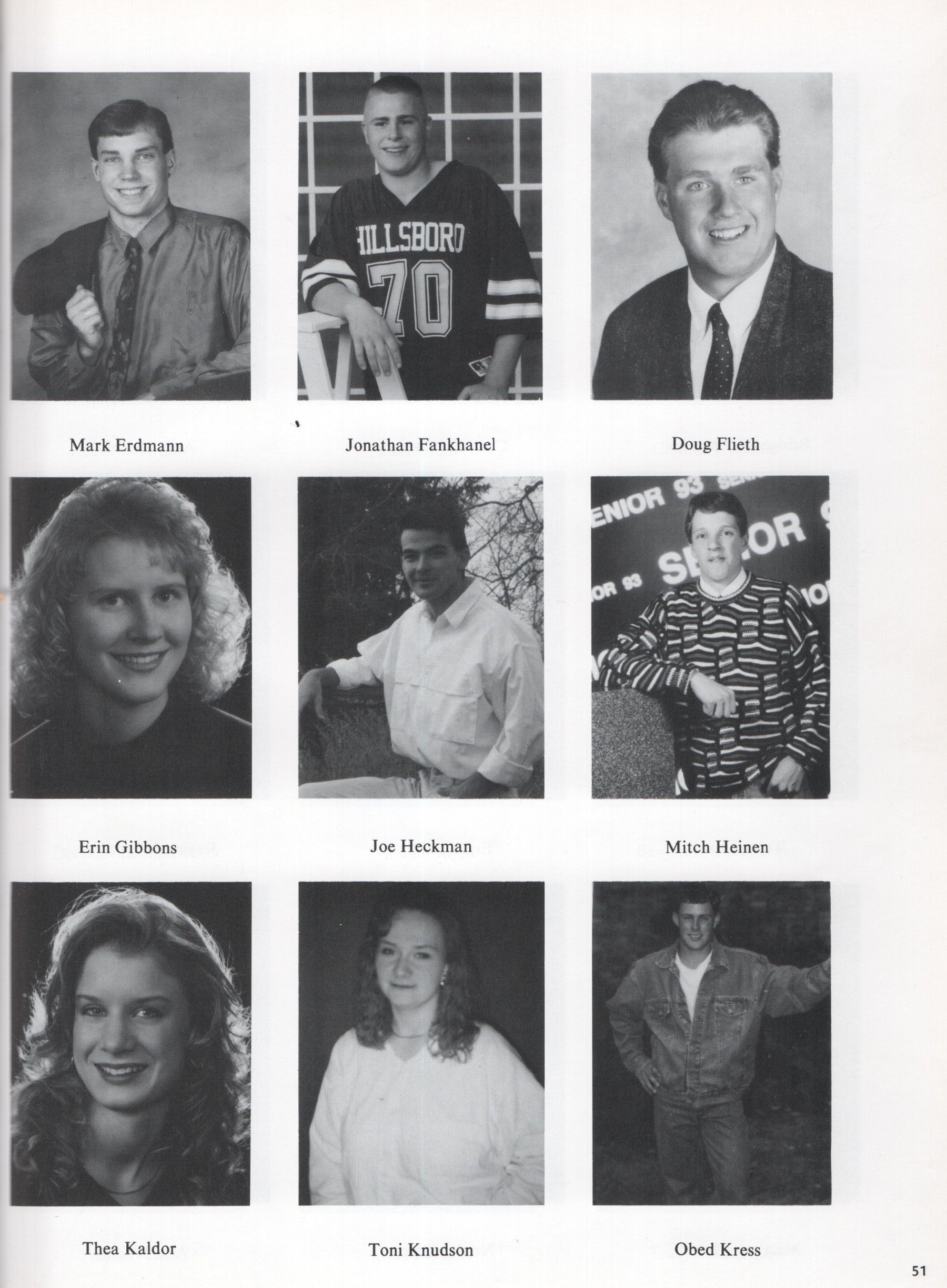 The Class of 1993 Hillsboro High School Yearbook, titled: Breakin’ Out, includes four pages of Class of 1993 Senior student photographs for: Corey Ackerman, Jay Alfson, Sheila Bakken Jason Bedard, Kara Bertsch, Alana Boeddeker, Amy Christians, Elenore Cotton, Steve DeLaCruz, Mark Erdmann, Jonathan Fankhanel, Doug Flieth, Erin Gibbons, Joe Heckman, Mitch Heinen, Thea Kaldor, Toni Knudson, Obed Kress, Bridget Kritzberger, Kody Kritzberger, Amy Larson, Trent Liska, Erik Lundby, Jeremy Magnuson, Matthew Meyer, Noah Miller, Ann Mueller, Robert Oelrich, Carl Olimb, Casandra Rauser, Doreen Schumacher, Nathan Smith, Benjamin Steinberger, Teresa Vettel, Jared Wika, and Tracy Winterquist.