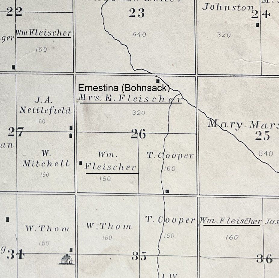 As a young in his late teens and early twenties, William (Wm or Bill) Fleischer soon claimed and farmed lands in the SE Qtr. of Sect. 22, the SW Qtr. of Sect. 26, and the NW Qtr. of Sect. 36 in Bohnsack Township [see 1892 plat map, below]. Note that Wm Fleischer's land was located near the home farm in the N-half of Sect. 26, which by 1892 was owned by his mother, Mrs. Ernestina (Bohnsack) Fleischer, as her husband, CW Fleischer, had gone to mine gold in Helena, MT (see TCHS Catalogit Family History entry 2025.12.1).