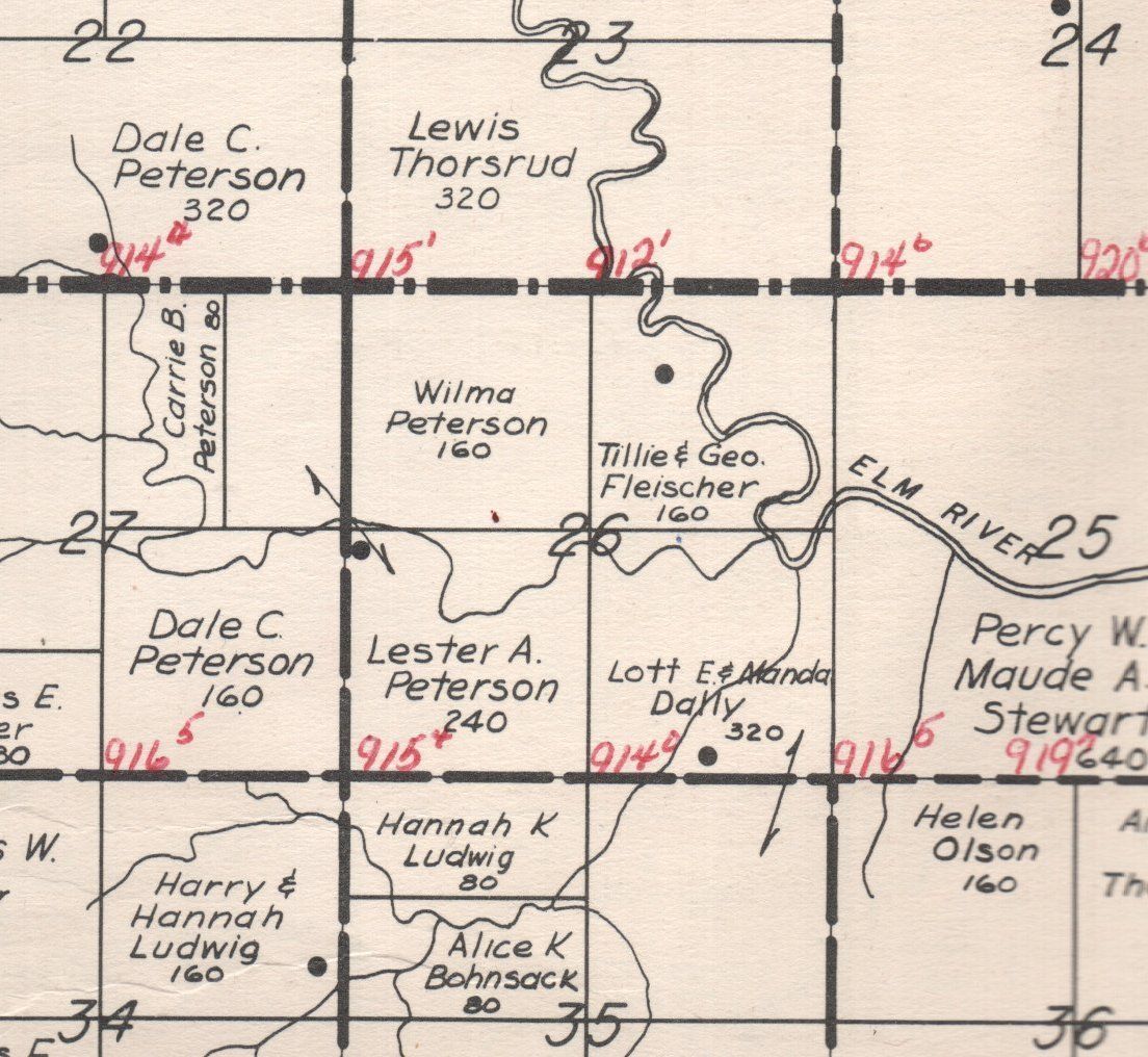 Bill and Lizzie Fleischer's fifth daughter and last child, Wilma Fleischer, was born in Bohnsack Township on 3 December 1899, about two months after her father William Fleischer died on 2 September 1899. After her mother, Lizzie (Johnson) Fleischer married Chris Krohn in about 1905, Wilma lived with her family in McIntosh County, Minnesota. At age 5, Wilma was baptized on 25 June 1905 into Trinity Lutheran Church in McIntosh [ELCA Church Rec.]. At age 20, on 18 December 1920, Wilma Fleischer married Lester A. Peterson, age 19, of Bohnsack Township. Lester was born on 22 March 1901 in Traill County. Lester and Wilma farmed some of the original land owned by Wilma's father, William Fleischer [compare the 1892 plat map with the 1952 plat map]. Lester's brother, Dale C. Peterson farmed nearby. Wilma lived to the grand age of 97, passing away on 29 September 1997 at the hospital in Hillsboro. Wilma was interred at the Riverside Cemetery in Hillsboro.