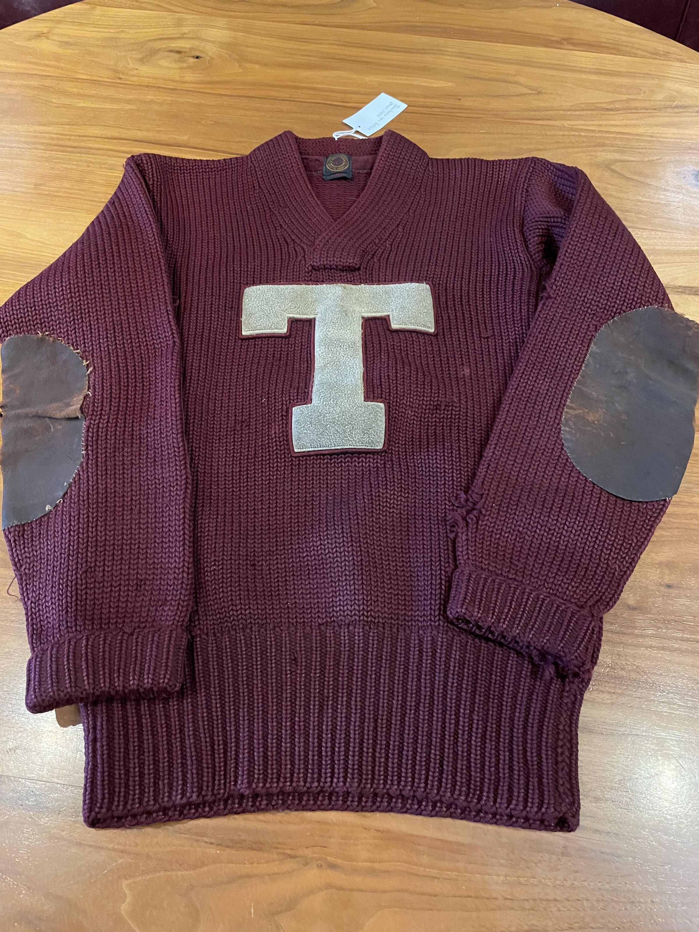 Red wool sweater with leather elbow patches and white T appliqued to front. Dannheiser's name is stitched into the hem. Sweater belonged to Dannheiser who played football in 1935.General Notes