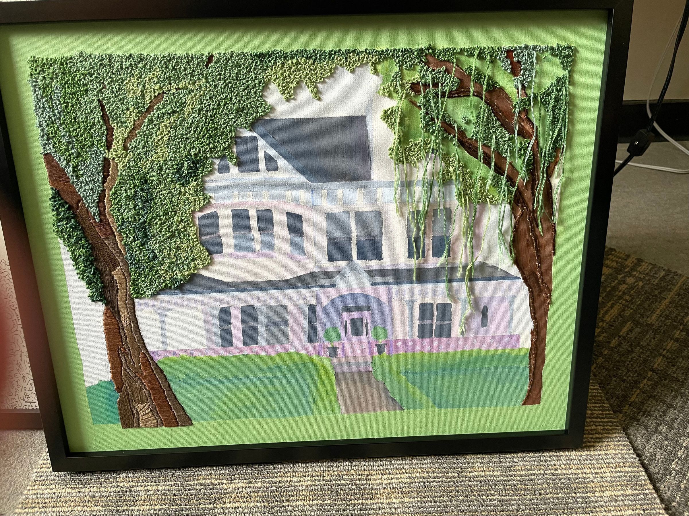 Painting of home with trees embroidered in the foreground.