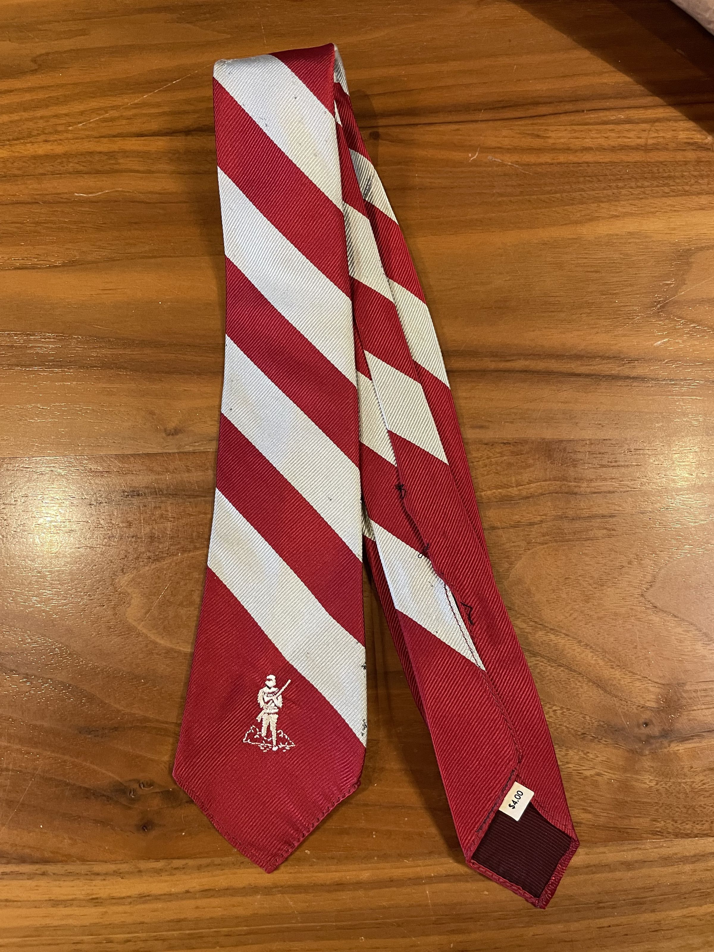 Red and gray striped tie with embroidered pioneer.