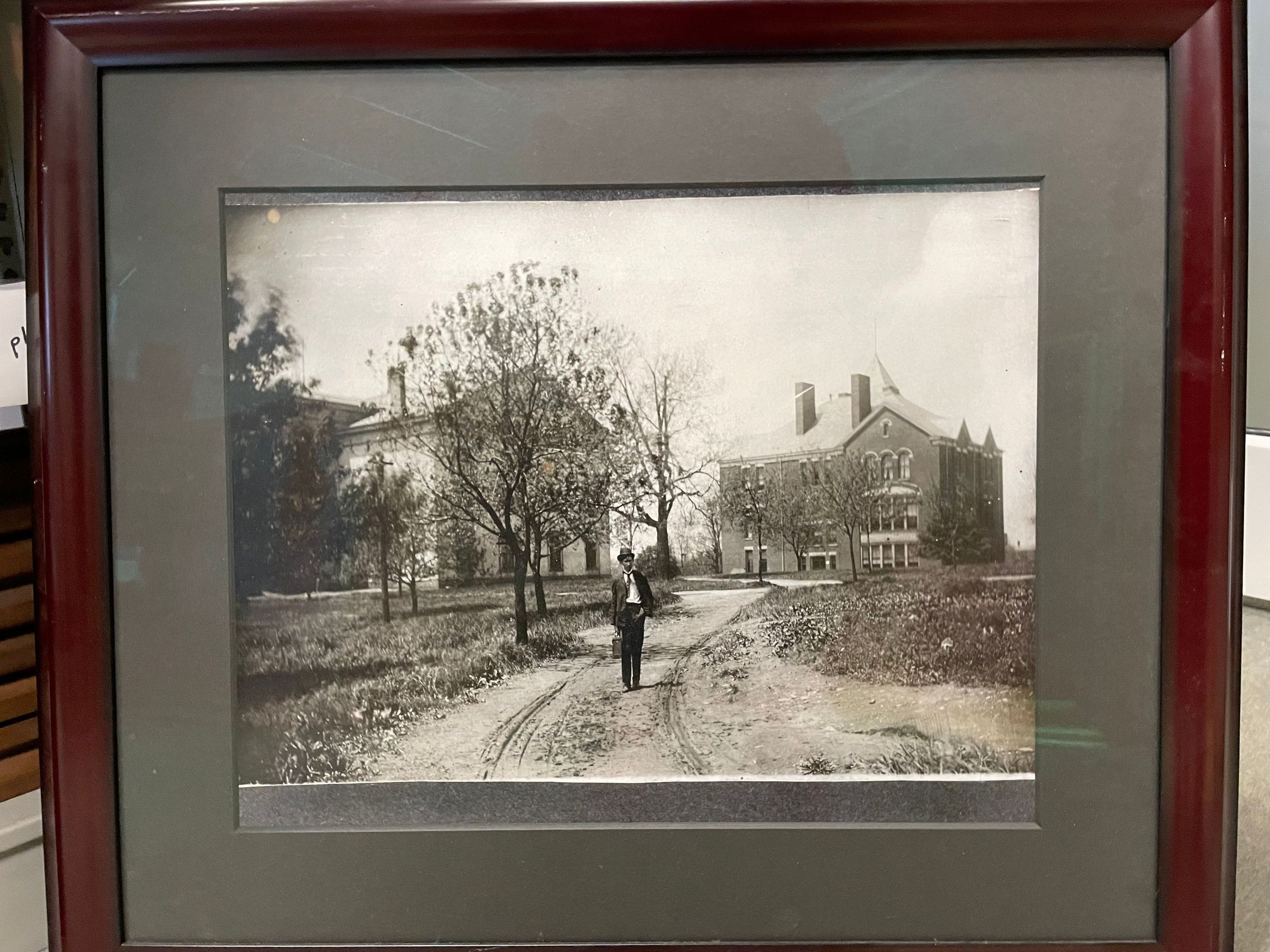 Copy of late 19th or early 20th century photo of campus with man carrying satchel. Photo shows the back of Morrison and the College of the Bible.