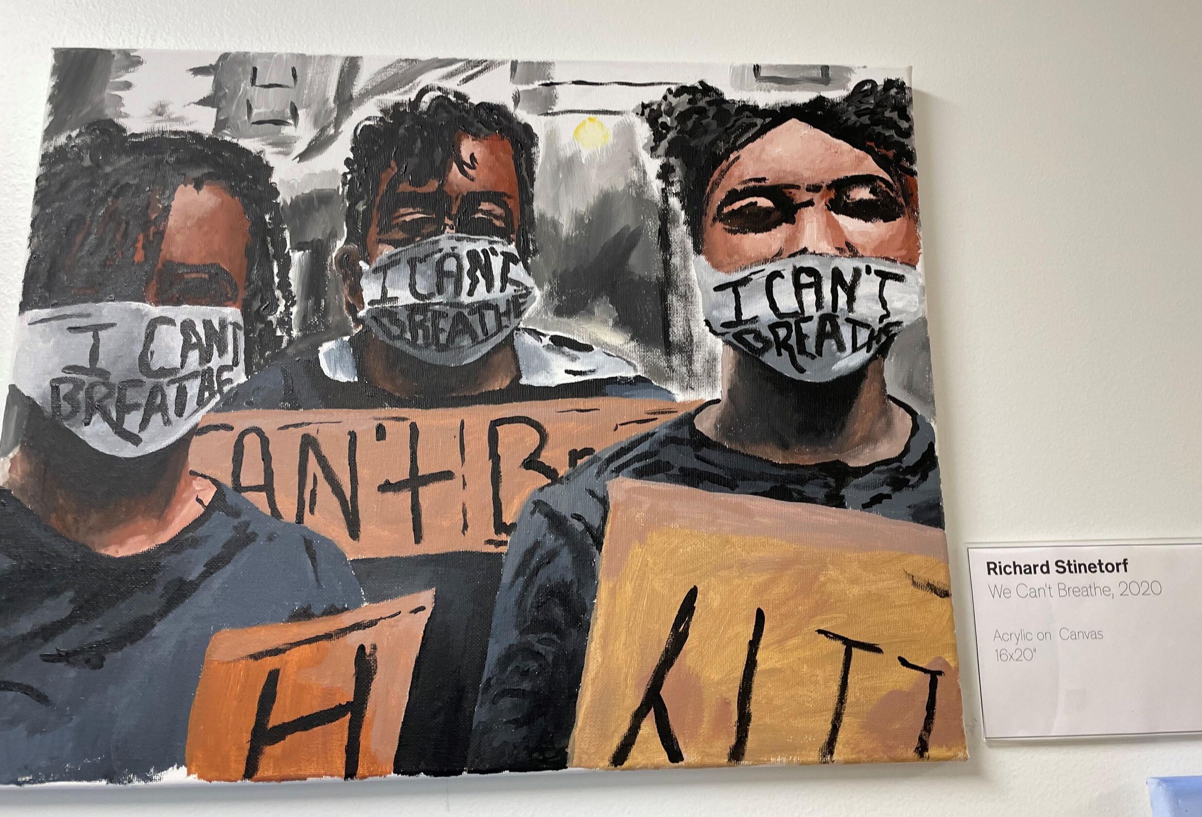 Acrylic painting of three people carrying signs and wearing masks that say "I can't breathe." This painting was donated to the college by a student.Made/Created