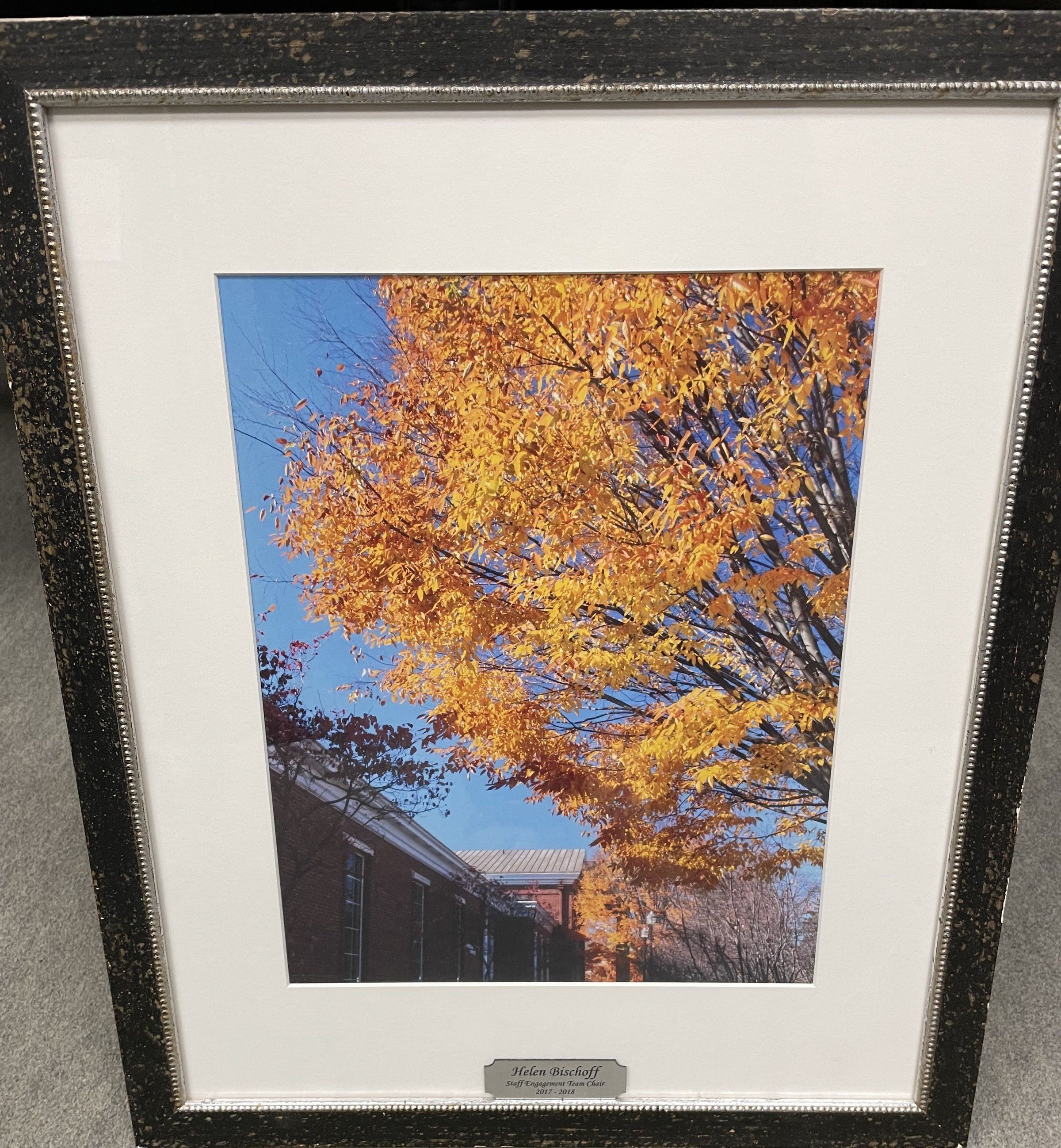 Color Photograph of the TU Library in the Fall. Foreground is dominated by yellow/gold leafed tree.
