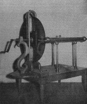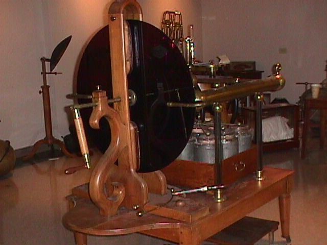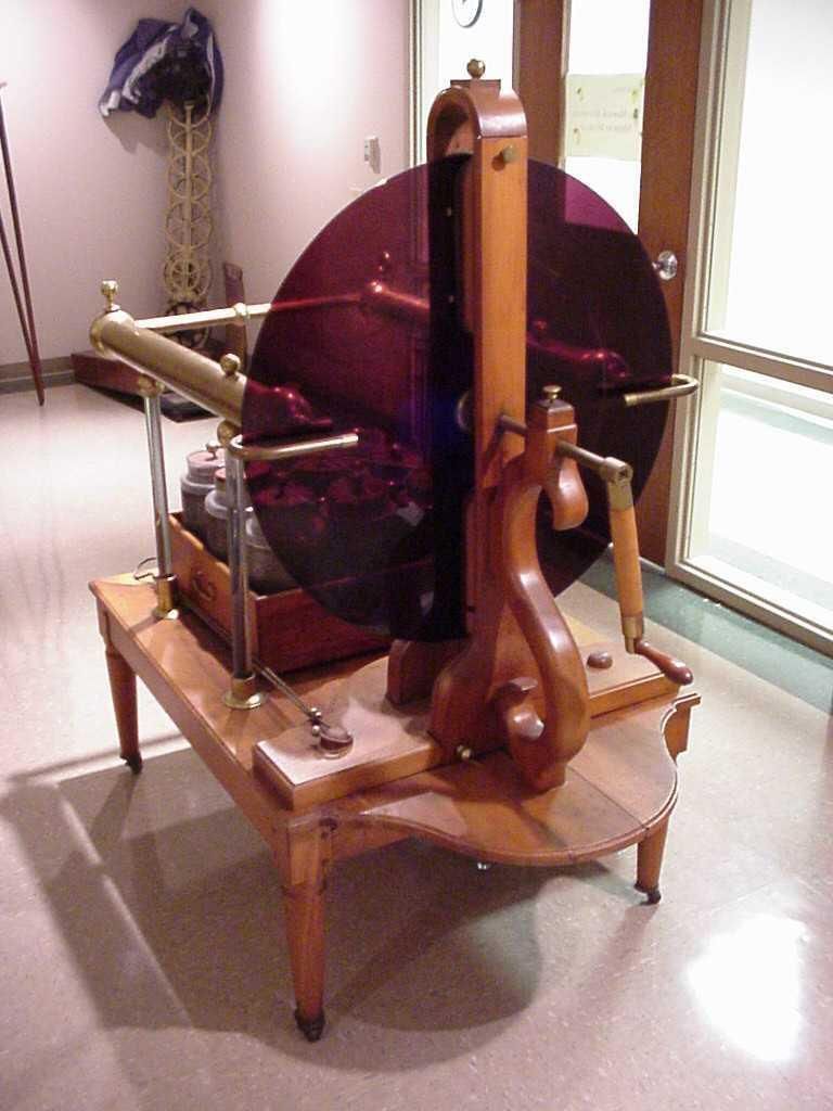 A common part of generator of static electricity. This particular machine was bought over a century ago at a cost of $195.00. It has unusually large hollow brass prime conductors. The extremities of these conductors end in two bows which, in turn, have sharp points to facilitate the passage of electricity from the large glass plate, but all other parts are rounded in cylindrical or spherical form, without edges or points, in order that the electricity produced by the machine will not be dissipated. This machine has a purple glass thirty-three inches in diameter.