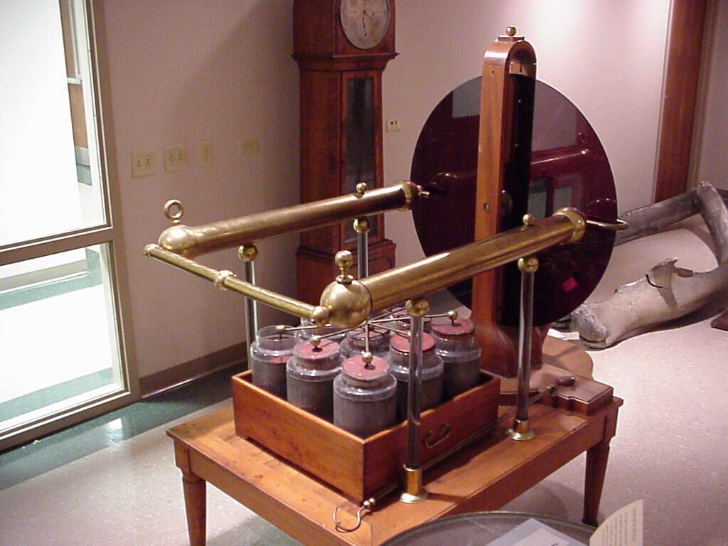 Most nineteenth century texts on natural philosophy and many catalogues of the same period have figures on machines of this type. A good general discussion of important persons in the development of electricity is given by Bern Dibner (Early Electrical Machines (1600-1800), 1957). He includes in his remarks descriptions of early experiments and apparatus. On page 42 of his account is a good photograph which resembles very closely this machine in our collection. Dibner says that his was the type of machine used by Nicholas T. de Saussure, professor of Geology and Mineralogy at the University of Geneva. The machine was built by Dumotiers [z] Frères, Paris.Collection