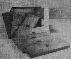 This is a set of glass shapes mounted in mahogany sliders. The glass is one-half inch thick, sometimes is single and sometimes in sections. The glass is unannealed and consequently when viewed by polarized light shows rainbow colors along the lines of internal tension. These are in excellent condition. Made by W. & S. Jones, London.