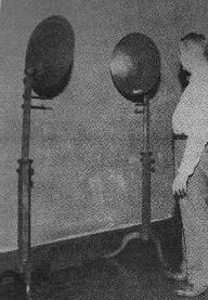 These reflectors can be placed from ten to fifteen feet apart, and then when a red hot iron is placed at the focal point of one reflector it will cause an inflammable substance, such as phosphorous, to be ignited at the focal point of the other reflector. These reflectors are mounted on tall wooden standards.