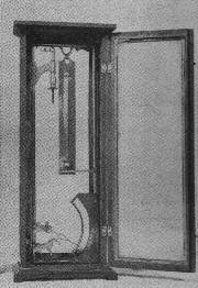 A portable model (with refinements) of the Saussure type, It was bought by Dr. Caldwell of Pixii, Paris. This particular hygrometer, according to the catalogue descriptions, is activated through employment of a human hair. Vol IX (p. 35 and plate CCXLVII) of the 3rd edition of the Encyclopœdia Brittanica refers as follows to Saussure's Portable Hygrometer, "Apparently the fixed (great) and the portable hygrometers were first described by Saussure in an article (essay) on Hygrometers published in 1783. Suassure was a professor of philosophy at Geneva. The human hair is the activating agent in both types."
