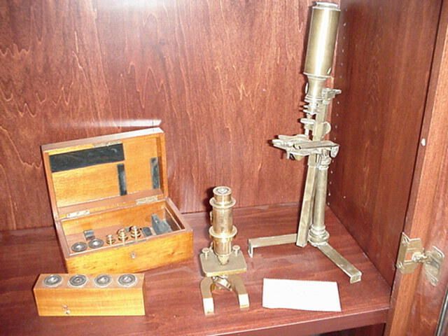 A compound microscope, known in its day as "Jones most improved," is a complete instrument with insect boxes, fish through, auxiliary magnifiers, etc. It represents the peak of compound microscopes during the early nineteenth century. The microscope is now in only fair condition and the mirror is missing.