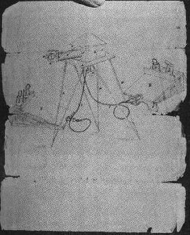 An early sketch showing the way in which the lime-light projector was made ready for use. One of the bellows was filled with oxygen, the other with hydrogen. The pressure exerted by the weights was sufficient to force these gases from the nozzles within the hood. Knight's Dictionary (1877) describes the Oxyhydrogen Lamp as an improvement over the Oxycalcium light in these words, "one in which streams of oxygen and hydrogen in regulated quantities are commingled, the resulting flame being directed on a ball of quicklime and forming an extremely bright light; now used very largely by lecturers on science to illustrate phenomena, and by exhibitors to project pictures upon a screen."