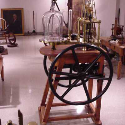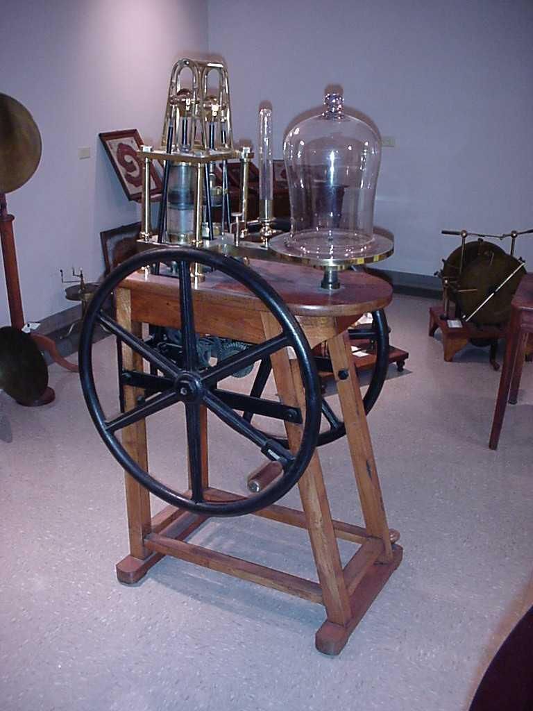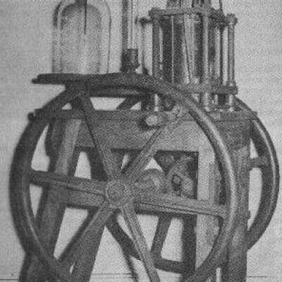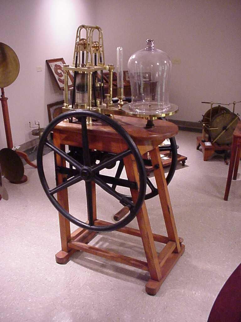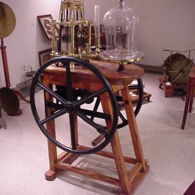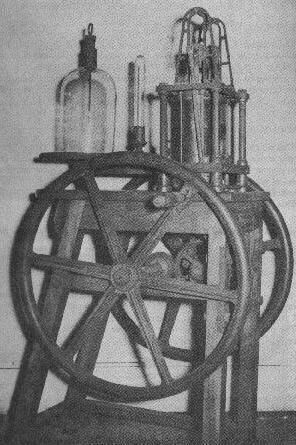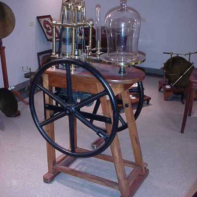 Description from L.A. Brown's 1959 catalog: "A pump notable not only for its size and weight but for the fact that it was the first "continuous movement" pump. It was made by the famous instrument maker, Charles Chevalier. Extensive notes came with this pump. They are concerned with its operation, cleaning, etc. Chevalier made several styles of continuous motion pumps. One was made with a single fly wheel instead of the two as in the pump illustrated. A sliding rod receiver is shown in the platform of this pump.