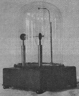 The battery base of the apparatus shown is slightly more than seven inches on the side and it contains four sections of the pile with each section about five inches long. The pile, in cross sections, is roughly the diameter of a quarter of a dollar. Above the base a horizontal wire is suspended by a very fine filament. This wire has a small knob at one end and a flattened disc at the other. The disc moves slowly from one pole to the other. This motion has not ceased in the twenty-seven years we have seen the apparatus and probably not for the one hundred and twenty years since its purchase."Collection