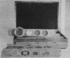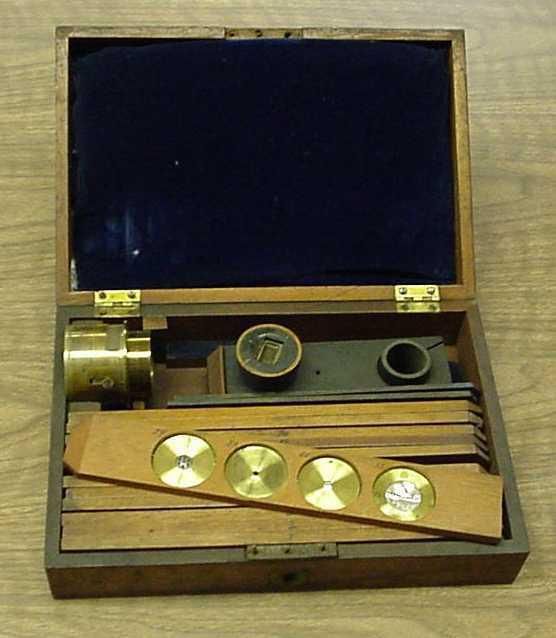 Description from L.A. Brown's 1959 catalog: "Figure 86 shows a velvet lined mahogany box which is 10-3/4 x 7-1/4 x 2-3/4 inches in size. In the box are found twelve wooden sliders. Each slider has four brass inserts. In the center of each insert is either a pattern of neatly arranged perforations of a steel grating or screen. These sliders are made to pass through the base of a viewing disc (see upper slider in illustration) which, in turn, has rectangular steel grating. This apparatus certainly is designed to illustrate some principle of light."Collection