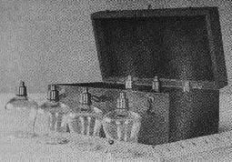 Description from L.A. Brown's 1959 catalog: "Figure 87 represents a small (9 5/8 x 5 x 4 inches) well made box which is divided into eight compartments. In each velvet lined compartment there is a small belljar or receiver. These receivers are not all precisely of the same shape. Their brass tops appear to be made to fit into some receptacle. They have no obvious musical tones when struck."Collection