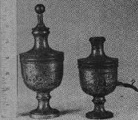 Description from L.A. Brown's 1959 catalog: "The two items in Figure 89 do not necessarily belong together except that they are obviously made of the same kind of brass and have the same general appearance. Frequently the "qualities" of the brass help in assembling the scattered parts of an instrument. These brass "vases" ("urns") are alike in shape, have open bottoms, one (to the right) has an electric contact shaped like a spout at the side, while the other has an insulated contact at the top. As is true of much of the brass in the collection, these instruments, in some past time, have been coated with a heavy layer of shellac."Collection