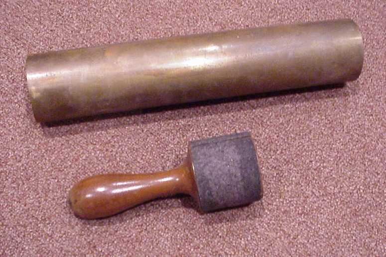 Description from L.A. Brown's 1959 catalog: "Figure 90 represents a brass cylinder open at both ends. A well made felt covered plunger just fits into the cylinder and can slide all the way through if allowed to do so."Collection