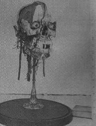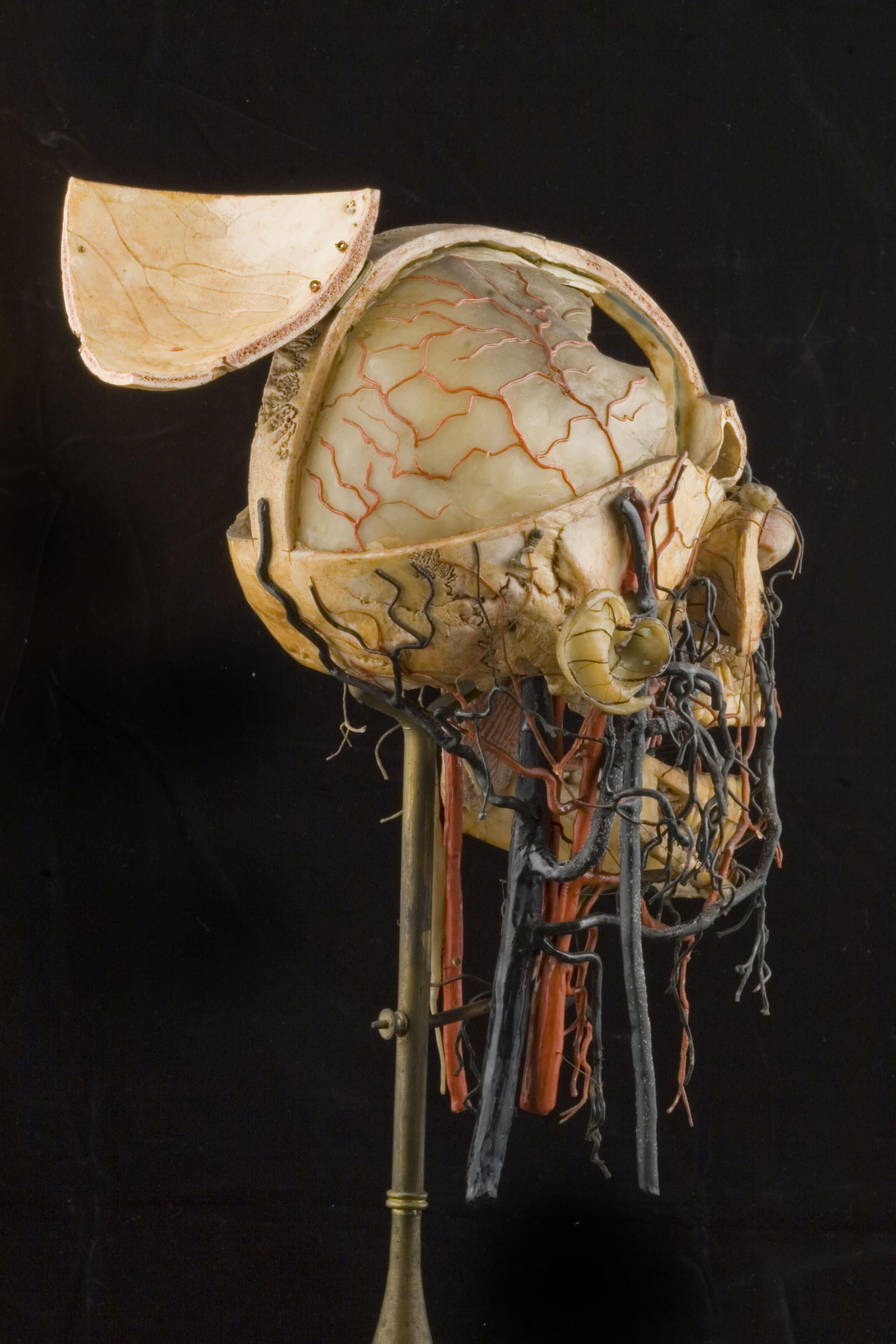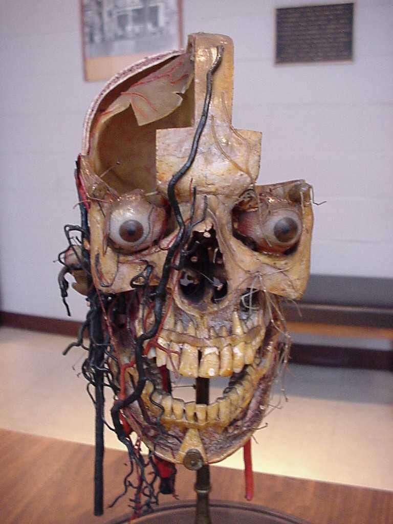 Description from L.A. Brown's 1959 catalog: "This is a human skull which has been sawed to show the cavities. Nerves, blood vessels, glass eyes, and some muscles have been added to show in considerable detail the relationship of these structures to the bones, teeth, etc. Impacted wisdom teeth show plainly in the lower jaw. This head was purchased from Guy (Paris) for 140 francs in 1839. It is listed in Guy's 1850 catalogue at 170 francs."Collection