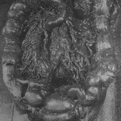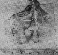 Description from L.A. Brown's1959 catalog: "Figure 114 is a model of the right side of the face showing a dissection of the parotid gland and its duct. Although it cannot be seen in the figure, a bit of realism was added in the form of a glass eye. Originally the model was mounted on velvet and framed as the models of the stomach were treated.