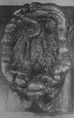 Figure 115 of the colon is representative of the larger and more complex models. It is in full color and shows remarkable detail. The liver and the stomach appear at the top while the urinary bladder is show resting on the pubic arch. Some damage through shipping and breaking of the friable wax is apparent. The large glass dust cover is missing."Collection