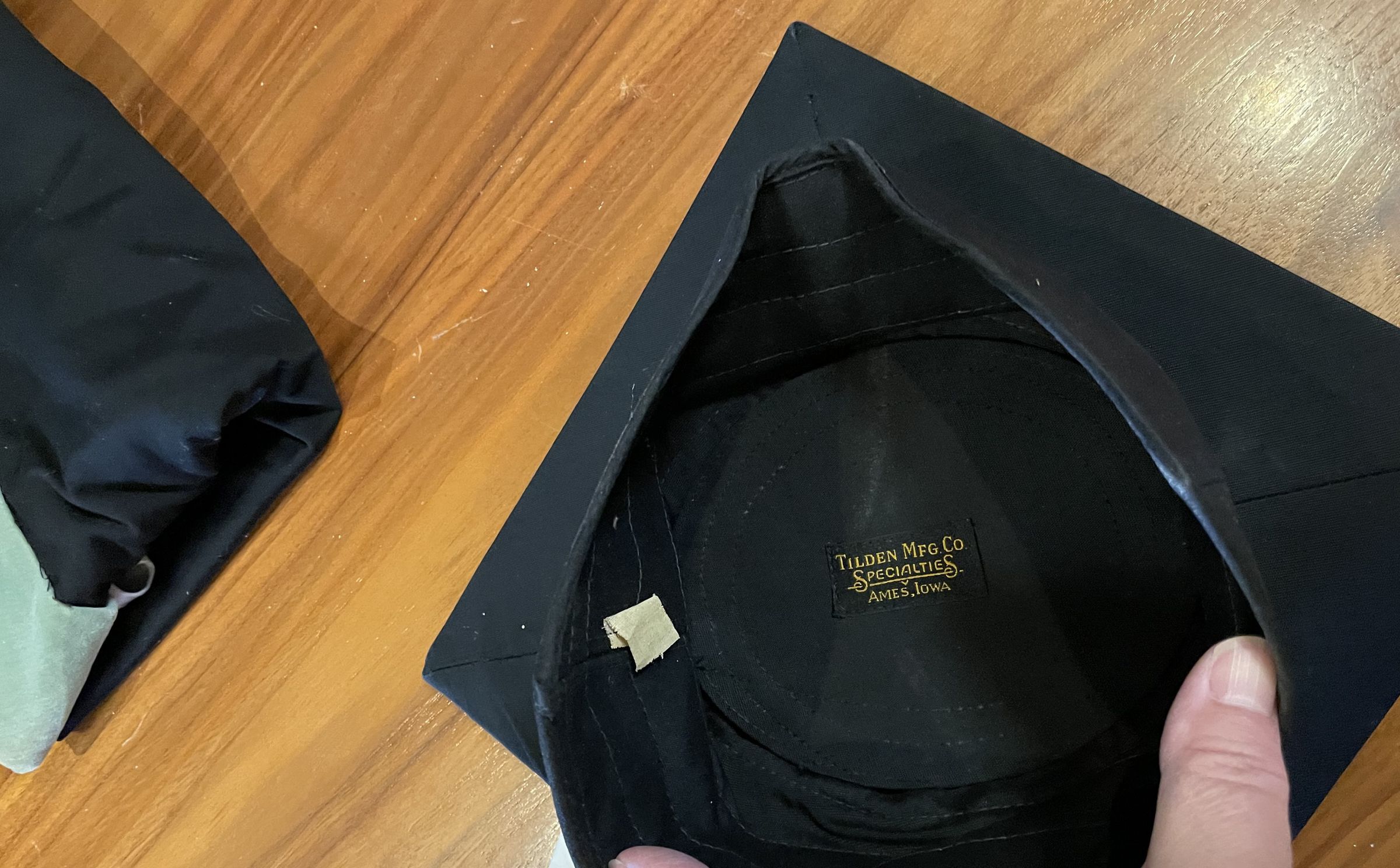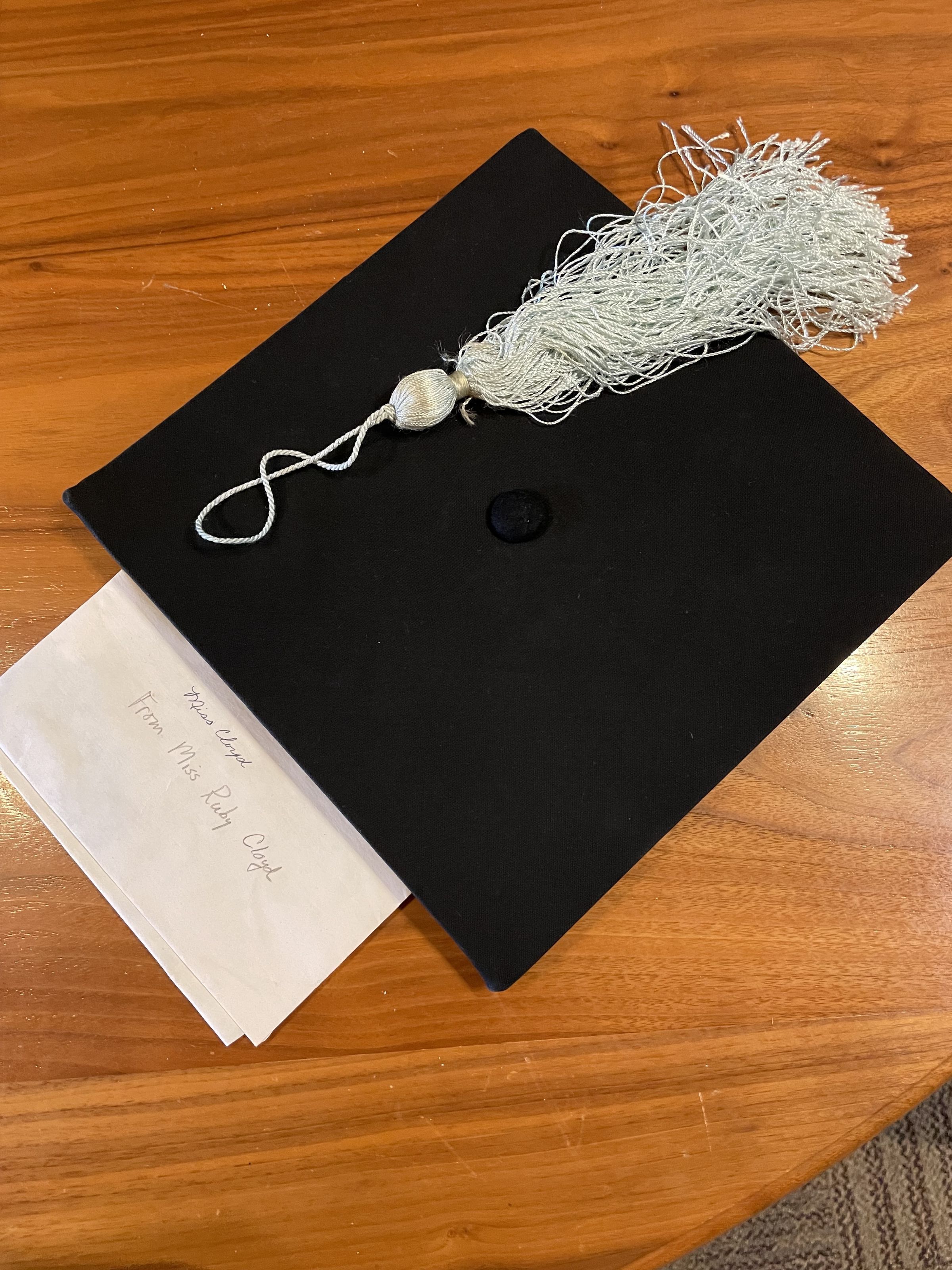 Mortar board hat and light blue or sage blue tassel. Size 7 1/8. Note says donated by Ruby Cloyd. Was found with a masters hood with light blue or sage blue velvet and a white silk interior.General Notes