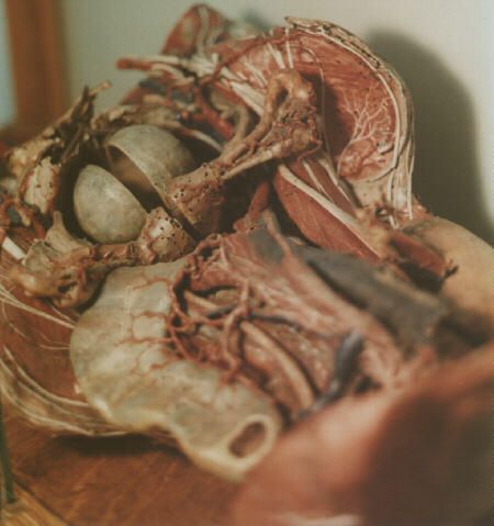 This is a wax model of the abdominal cavity of a human. The presence of ovaries shows that this model is of a female. Small labels, written in French, name the various organs, such as the colon and the kidneys.Collection