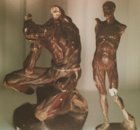 These two small human figures (male) are merely 10" in height. Made of plaster, both show some damage due to the passage of time. Both figures depict the human muscular system.Collection