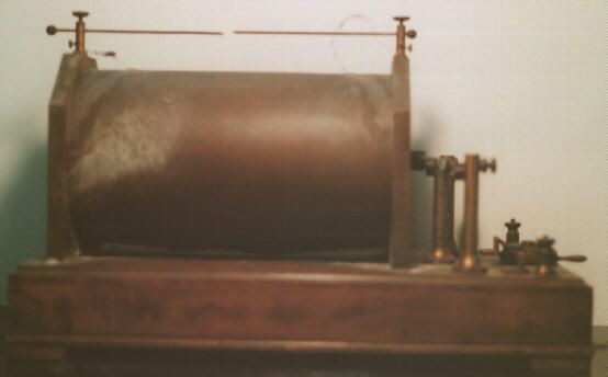 2.25" by 1" by 2.5" This unknown apparatus is made of wood, the use is unknown. There are 2 separate spinning systems, one vertical and one horizontal. The horizontal system spins a raised metal disc 9.5" in diameter.Collection