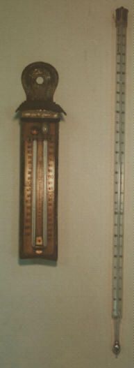 - The larger thermometer measures 19", reads from -15 to 125 degrees Farenheit, and contains mercury although it no longer works.