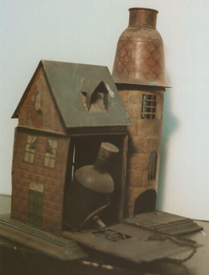 Stands 12.5" tall. The tin roof can be removed, and the wall is hinged allowing a jug to fall out.