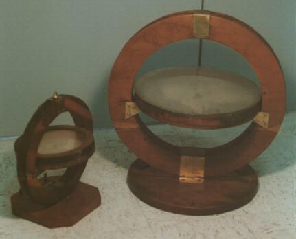 Each of these apparatus, one standing 19" tall and the other 12.5", is labelled from 0 to 90 to 0 to 90 and back to the original 0 around the outer edge of the circle. The vertical piece of circular wood is wrapped with wire. The base of each has what appears to be electrodes. One theory is that the devices measure electrical currents.Collection