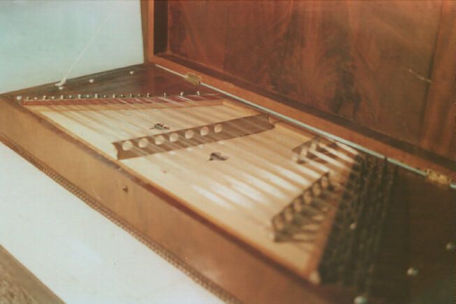 The dulcimer is about 3'3" long and 1'3.5" deep. The piece of wood behind the strings has two heart shaped holes through it. The strings are labelled in standard format.Collection