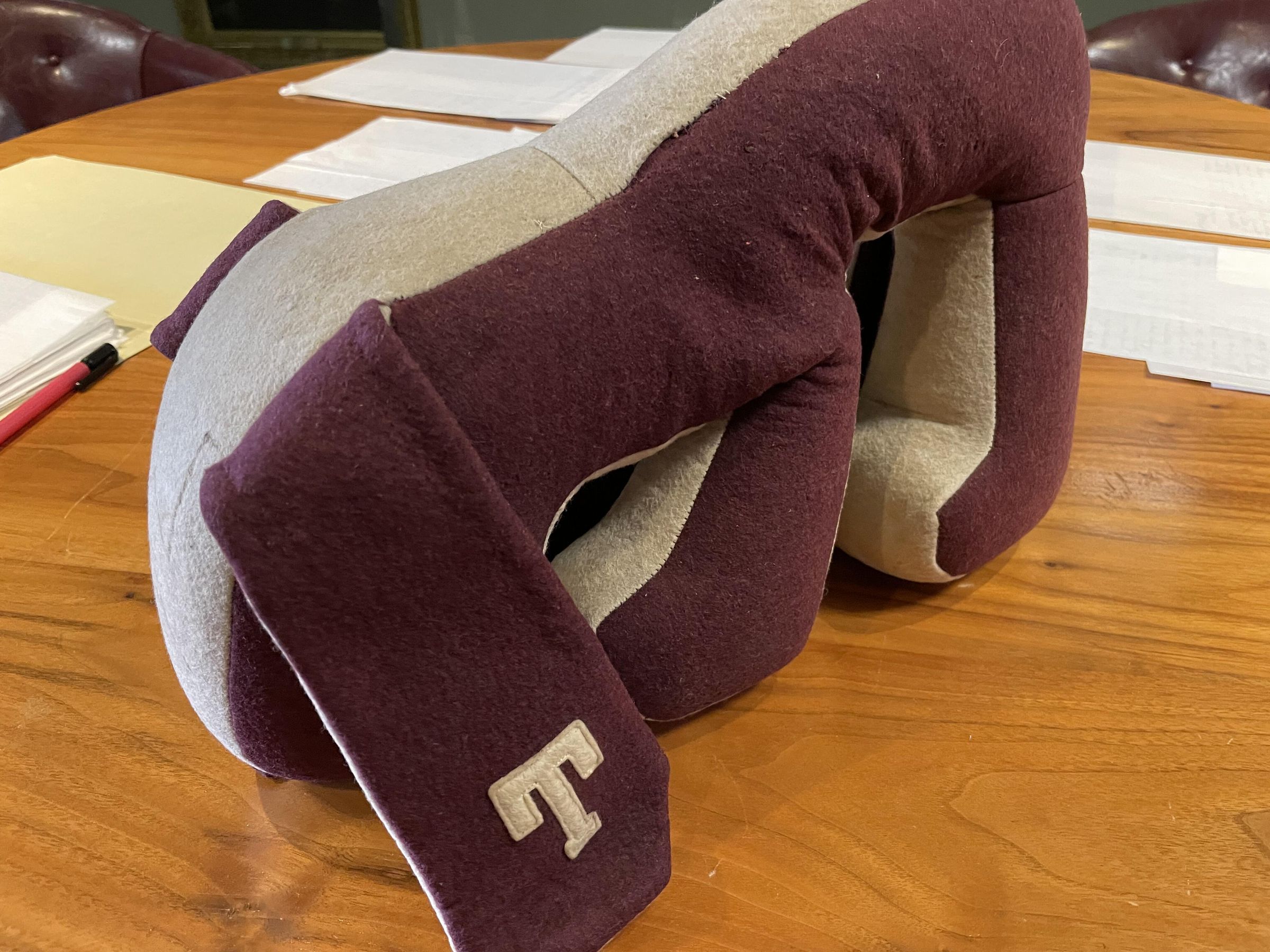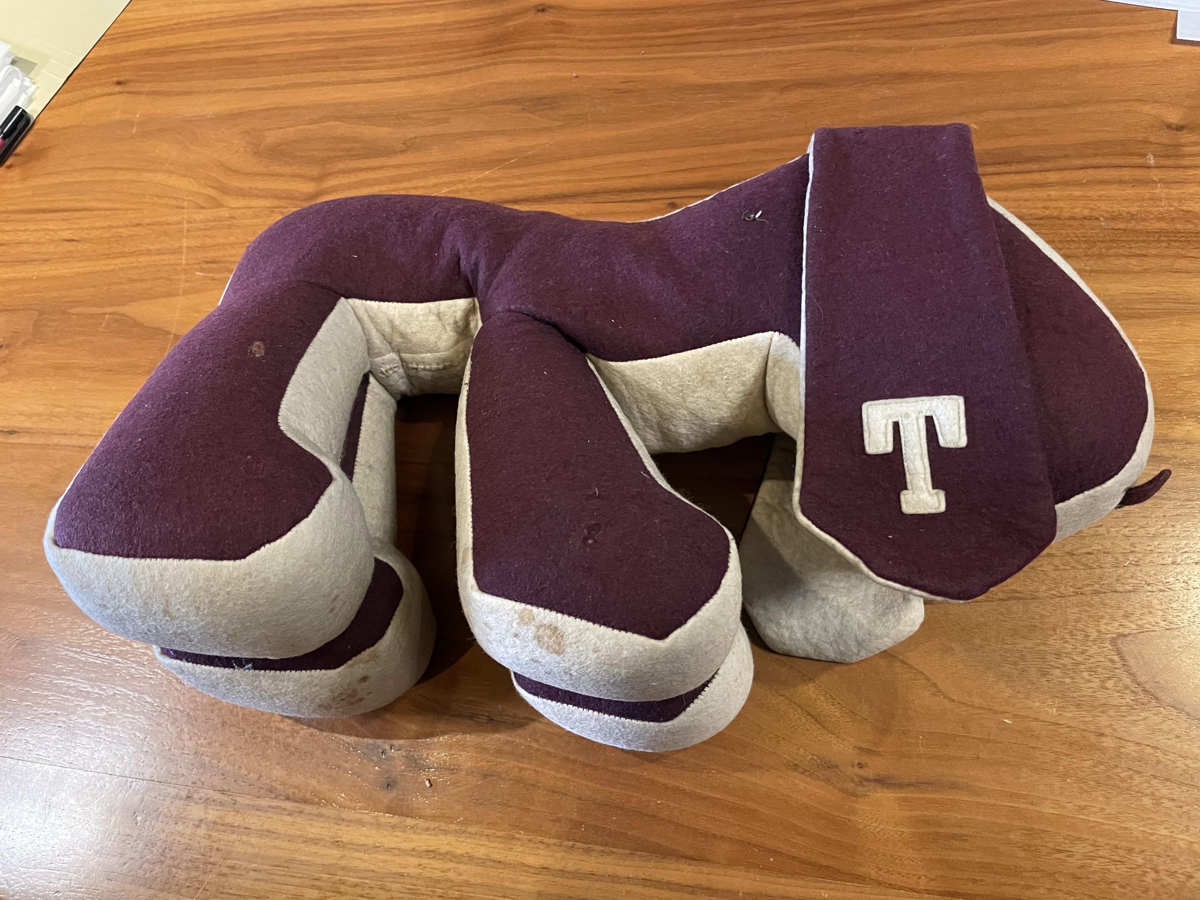 Red & white felt dog stuffed with sawdust, with T on ears and WAA written on forehead. WAA was the Women's Athletic Association. Probably dates from 1930s or 1940s; possibly used for autographs.Dimensions