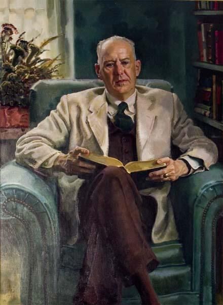 J. Winston Coleman sitting on green chair with open book in his lap by Welsh.