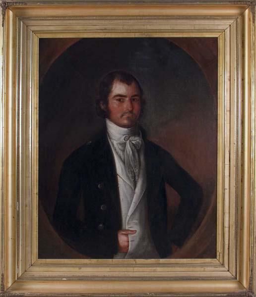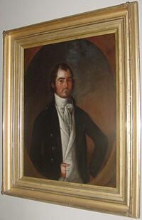 Unknown subject with right hand tucked into lower waistcoat by Jose de Salazar. Oval painting (tondo) in square frame. De Salazar painted in New Orleans. We don't currently know the subject of the painting (2013). Identified as a de Salazar by Estill Curtis Pennington.Artwork Details