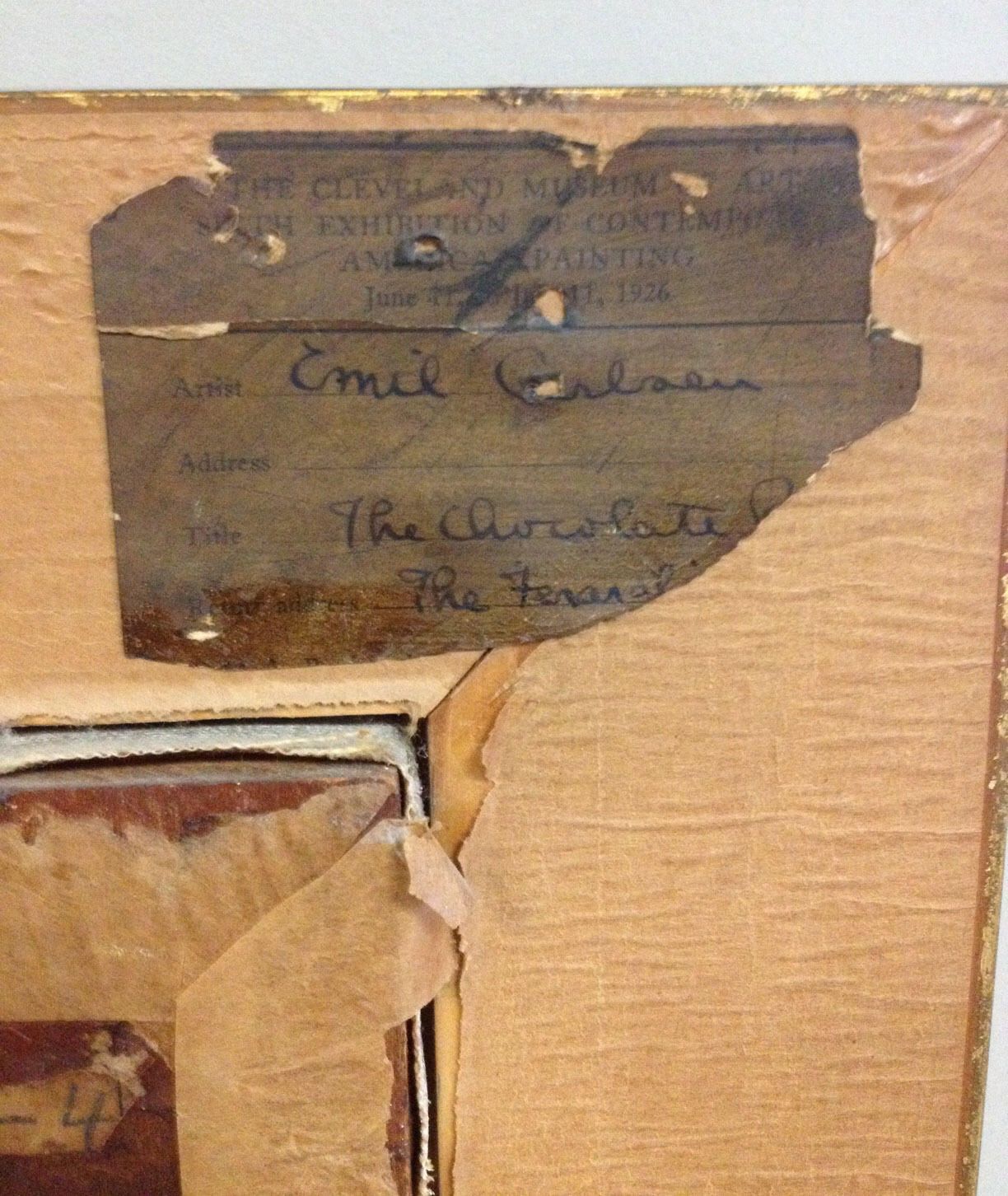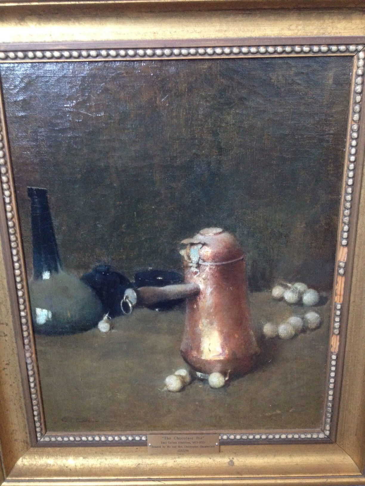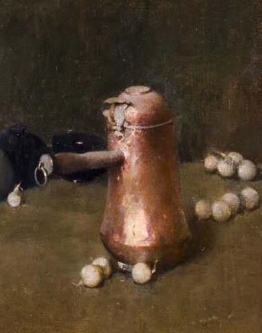 Painting of copper chocolate pot with handle by Emil Carlsen. Garlic on the table around the pot and dark blue vase in back. One tag on the back of frame that refers to an exhibition at the Cleveland Museum in the Sixth Exhibition of Contemporary American Painting in June 1926. More information at the Emil Carlsen Archives - http://emilcarlsen.org/portfolio/emil-carlsen-still-life-also-called-the-chocolate-pot-c-1917/Collection