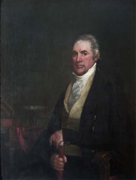 Portrait of Colonel James Morrison by Jouett or possibly by Suddoth Goff. This three quarter portrait shows Morrison from below the waist with hands resting on cane. Coat is open. College also owns half length portrait of Morrison.Collection