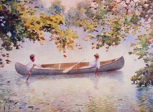 Reproduction of a painting by Sawyier depicting of two people in a canoe.Collection