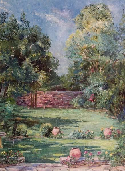 Garden scene by Morlan. Either oil or acrylic.Collection