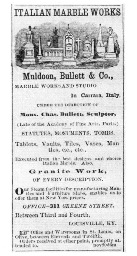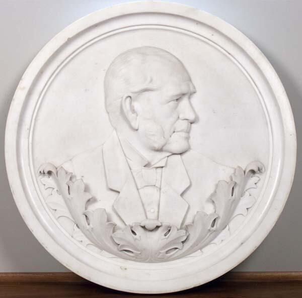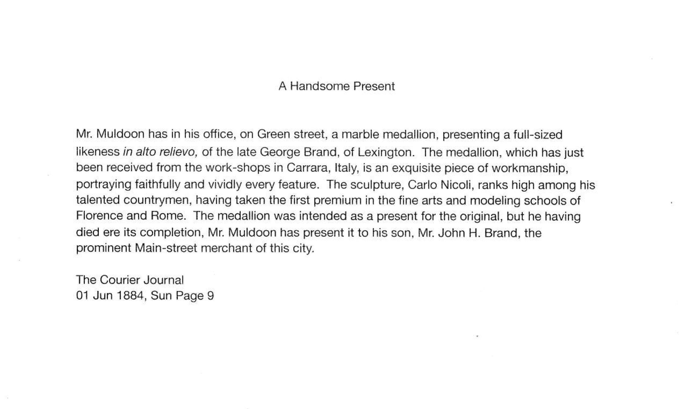 White marble relief bust of George Washington Brand by Nicoli. Round, large, medallion-like. According to a June 1 1884, page 9, article from the Louisville Courier Journal it is an alto-relievo. It was received by Mr. Muldoon of Muldoon, Barrett & Co. Marbleworks and had been intended as a present to Brand but Brand died before the gift could be made. The medallion was given instead to his son, John H. Brand.Collection